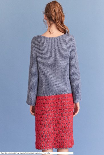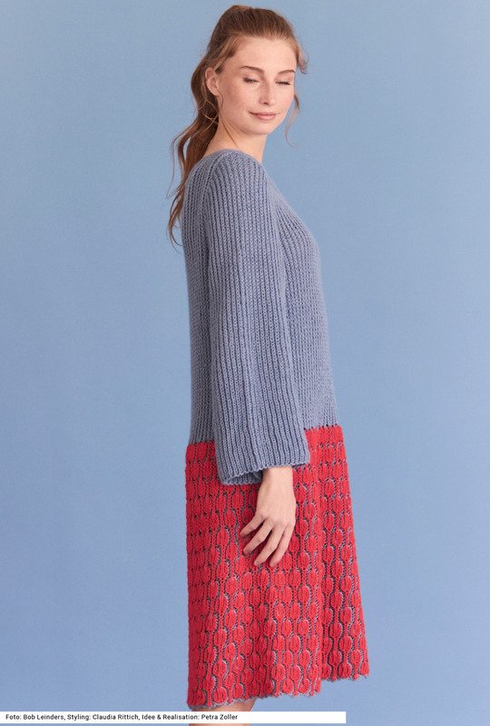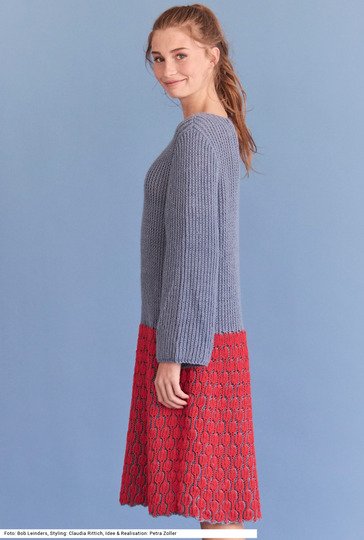 Dieses knielange Kleid macht alles mit. Es ist aus einem besonders weichen und strapazierfähigen Garn aus Microfaser und Polyamid gefertigt. Den zweifarbigen Rockteil im Briochemuster (Halbpatent in zwei Farben) strickt man in Runden, dann geht es einfarbig im Halbpatent ebenfalls in Runden weiter bis zum Armausschnitt. Die offenen, weiten Ärmel werden in Reihen gearbeitet. Die Maschen um den runden Halsausschnitt werden italienisch abgenäht, was den Ausschnitt besonders weich macht. Eine Anleitung steht für die Größen 36/38 und 40/42 sowie 44/46 bereit.