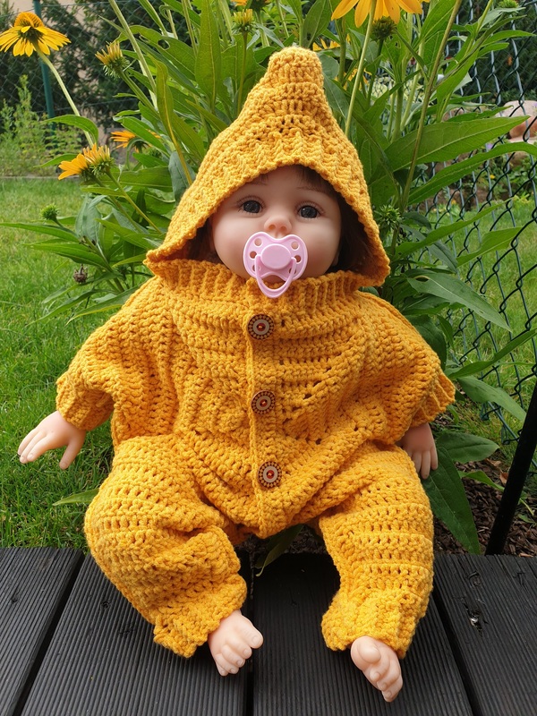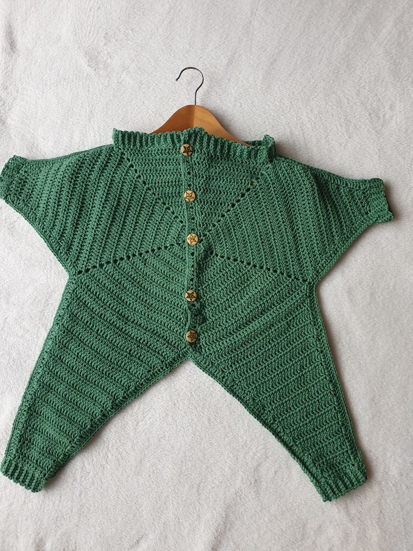Es ist anpassbar an alle Größen, denn es wird mit einem 5-Eck-Mittelteil am Rücken begonnen, dessen Länge von Schulter bis Schritt das Endergebnis bestimmt. Runden- und Reihenanzahl sind somit leicht abzuändern und der gewünschten Größe anzugleichen.