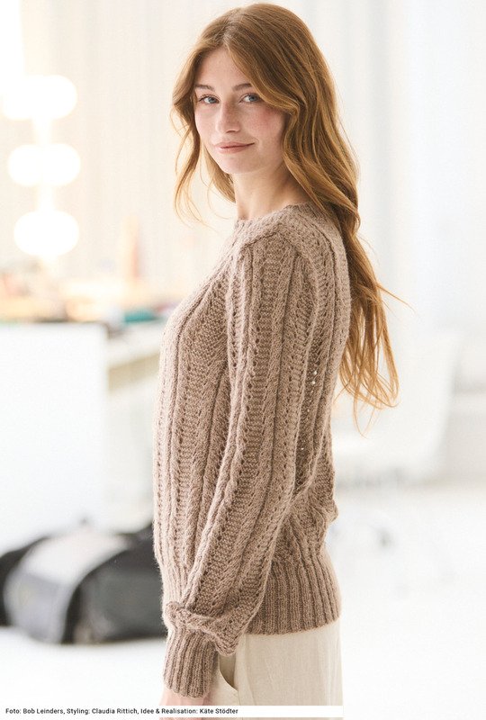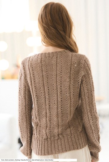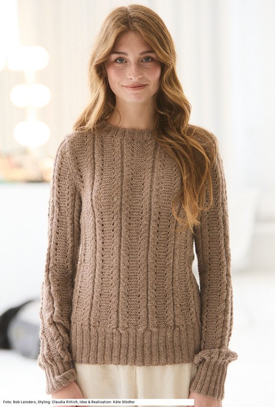 Dieser Pullover mit einer Kombination aus Lochmuster, kraus rechts und glatt rechts ist nicht abwechslungsreich zu stricken, sondern liegt auch herrlich sanft auf der Haut. Das liegt am Garn, das zu 100 Prozent aus weicher Lama-Wolle besteht. Lange Ärmel, durch die Armkugel sauber eingepasst an den Schultern und einem halsnahen runden Halsausschnitt hat er das Format eines klassischen Pullis. Alle Bündchen sind im 2/2-Rippenmuster gearbeitet und etwas hoher angelegt. Die Anleitung dazu gibt es für die Größen 36/38, 42/44 und 48/50.