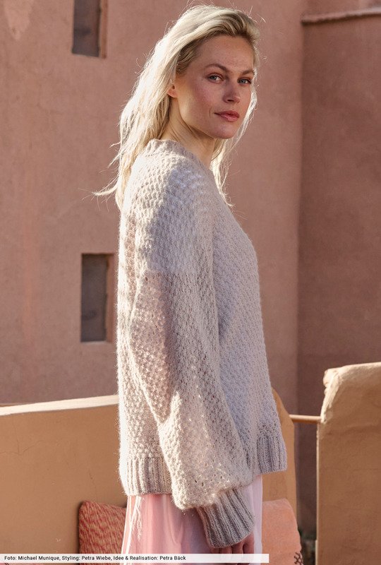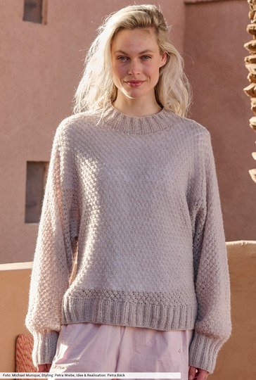 Ein Hauch Cashmere reicht! Kombiniert mit Wolle und Baumwolle entsteht ein hauchfeines Flauschgarn, das sich angenehm auf der Haut tragen lässt und trotzdem erschwinglich bleibt. Wir haben daraus einen locker fallenden Cosy-Pulli gestrickt, bei dem allover das traditionelle Dornröschenmuster zum Einsatz kommt. Elastische Bündchen bilden den klassischen Rahmen und bieten Formstabilität. Ein tolles Modell, das an einem Stück von Ärmel zu Ärmel gestrickt wird.