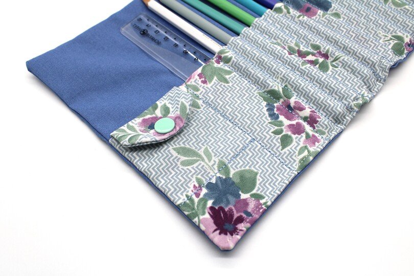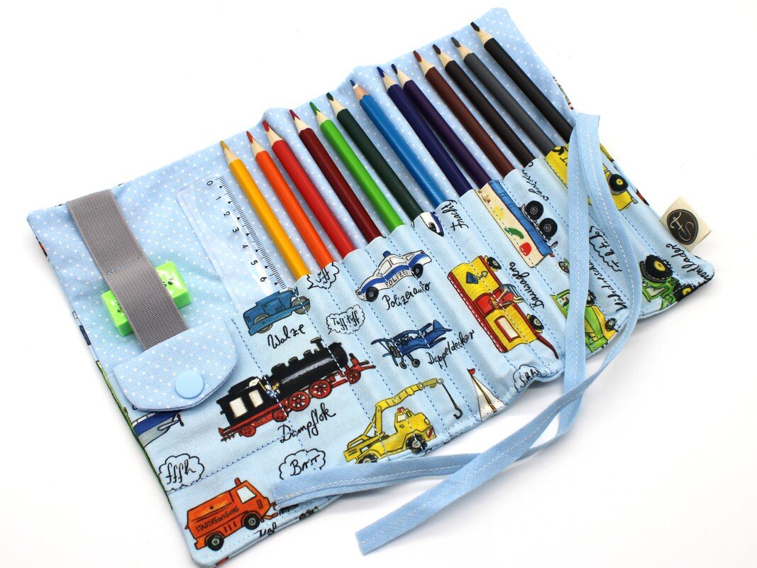Die schnell gestickten Stifterollen aus Baumwollstoffen sind praktische Begleiter für unterwegs. Sie bieten je nach gewählter Variante Platz für Buntstifte, dicke Buntstifte, Radiergummi, Spitzer, Lineal oder Kleingeld.
