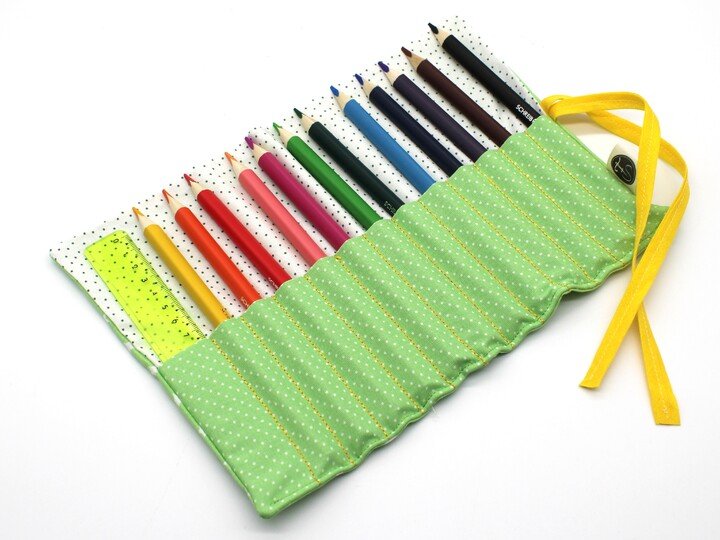 Variante 1: passend für 13 klassische Buntstifte, Lineal, kleines Täschchen, Gummizug für Radiergummi, Spitzer (hier kann der Gummizug auch weggelassen werden)