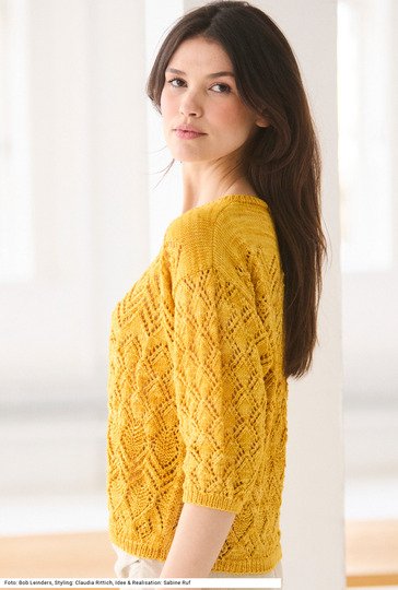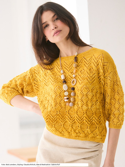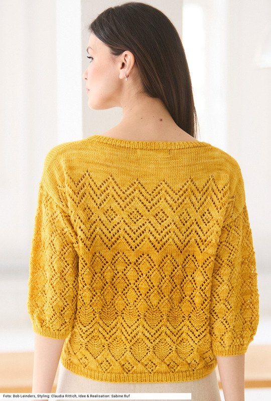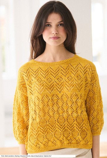 Bei dem Pullover mit 3/4-Ärmeln kommen drei verschiedene Ajourmuster zum Einsatz – dadurch ist er spannend zu stricken und ein Leckerbissen für versierte StrickerInnen. Das Garn aus reiner, weicher Merinowolle, das es in vielen Farben mit einem leicht verwaschenen Vintage-Effekt gibt, schimmert in unterschiedlichen Nuancen und sorgt für Abwechslung im Look. Die schmalen Bündchen und die Halsausschnittblende sind im 1/1-Rippenmuster gearbeitet und lenken nicht von der Opulenz der Muster ab. Eine Anleitung steht in den Größen 38/40, 42/44 und 46/48 zur Verfügung.