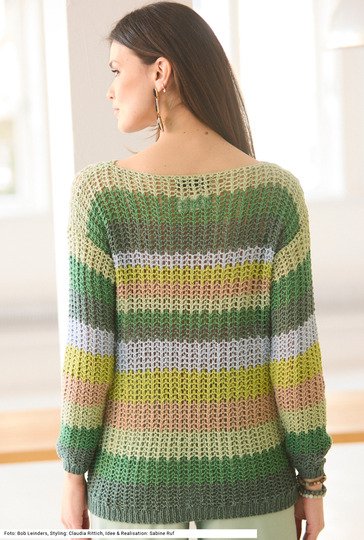 Ein einfacher Schnitt, dazu ein Netzmuster, das man auch mit wenig Strickerfahrung gut hinbekommt: Heraus kommt ein Modell, das zum Lieblingsteil avancieren kann. Der lässige Pullover punktet vor allem durch seine Farben, die in jeder Kombination gut aussehen – insgesamt sechs verschiedene Töne kommen hier zum Einsatz. Vorder- und Rückenteil sind einfach zwei Rechtecke, wodurch sich dann ein U-Boot-Ausschnitt ergibt. Das Garn aus Baumwolle, Schurwolle und Polyamid läuft flott über die Nadeln. eine Anleitung steht für die Größen 38/40, 42/44 und 46/48 bereit.