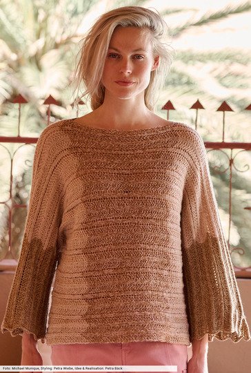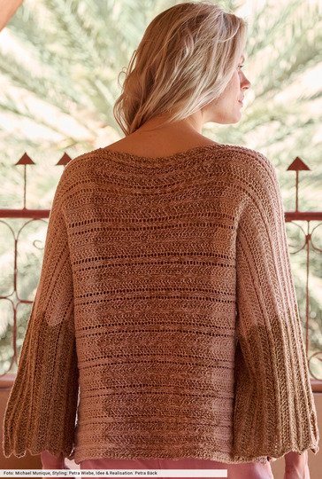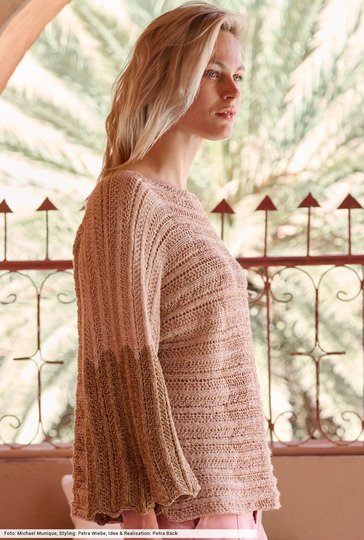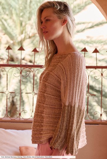 Aus einem sehr feinen Wolle-Cashmere-Garn entsteht dieser saloppe Pulli, bei dem wir drei unterschiedliche Farbnuancen miteinander kombiniert und zweifädig verstrickt haben. Dadurch erzielst du den weichen Farbverlauf, der sich in unauffälliger Blockstreifen-Optik präsentiert. Hinzu kommt ein semitransparentes Loch-Rippenmuster, das die gezackten Übergänge und die gewellten Saumkanten an den Ärmeln erzeugt. Ein weiteres Plus ist die Schnitt-Technik: Denn dieses Modell wird von Ärmel zu Ärmel an einem Stück gestrickt.