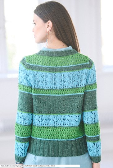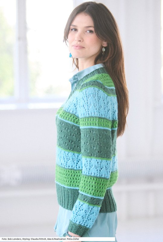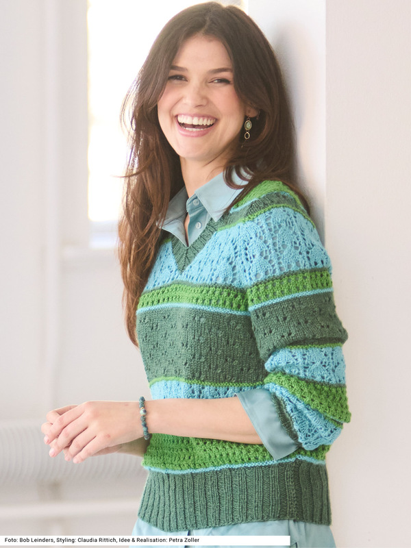 Der Pulli mit V-Ausschnitt ist wunderbar weich - denn er wird aus einem Garn mit halb Seide, halb Schurwolle gearbeitet. Dreierlei Muster: ein Gittermuster, ein Ajourmuster und ein kleines Lochmuster, dazu die Rippen am Bund. Außerdem wird das Modell in drei geschmackvoll aufeinander abgestimmte Farben gearbeitet, die in breiten Blockstreifen die Muster abgrenzen. Die Mustervielfalt ist was für Strickerfahrene, die die Abwechslung lieben. Die Ärmel mit Armkugel passen sich perfekt an die Schultern an. Eine Anleitung dazu gibt es für die Größen 36/38, 40/42 und 44/46.