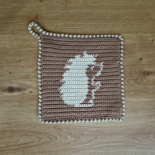 Mit der von mir verwendeten Wolle hat der Topflappen eine Größe von ca 20cm x 20cm