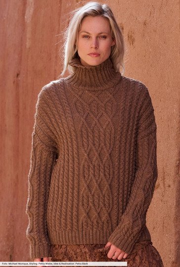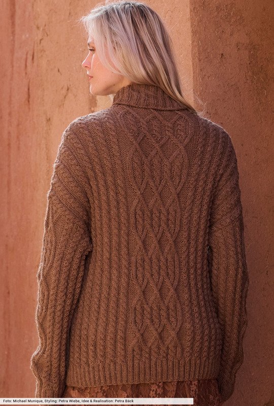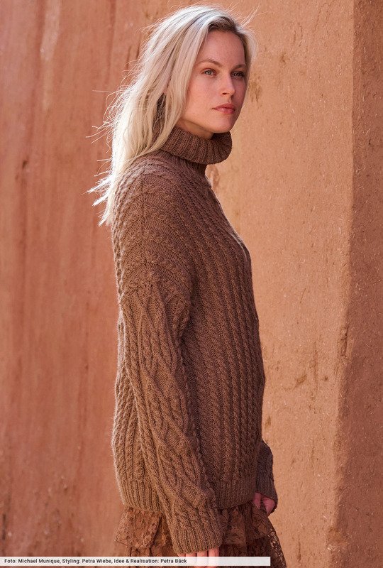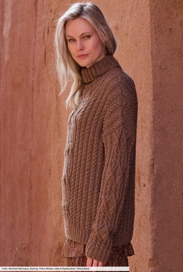 Dieser Pulli in cremigem Mandelbraun bringt durch seine markanten Zopfstrukturen dezente Eleganz plus Wohlfühlwärme aufs nächste Level. Dafür sorgt vor allem der kuschelweiche Garnmix aus Lama und Schurwolle, der höchsten Tragekomfort garantiert und in den du dich wohlig einhüllen kannst. Unser Fazit: Das hüftlange Modell lässt uns den Herbst in vollen Zügen geniessen und begleitet uns bis weit in den Winter hinein.