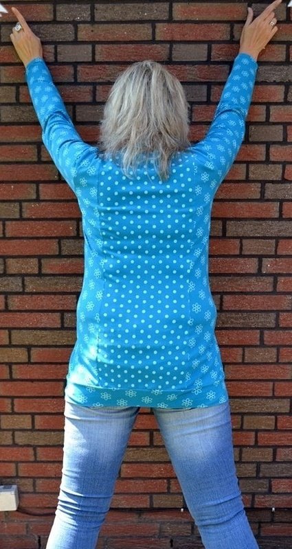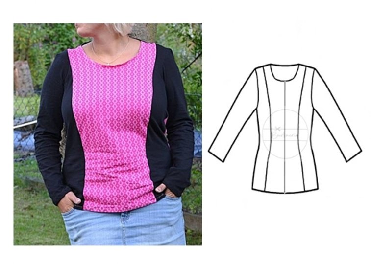 Mit dieser Anleitung und dem Schnittmuster näht ihr euch ein schickes Oberteil. Es ist ein leicht tailliertes Shirt mit langem Arm, bestehend aus jeweils 3 Schnittteilen fürs Vorder- und Rückenteil. Durch die Dreiteilung entsteht eine Vielzahl von Näh- und Variationsmöglichkeiten, da man auch verschiedene Stoffe und Muster mixen kann. Auch sind die längs verlaufenden Princess-Teilungsnähte ein kleiner Schlankmacher und geben dem Shirt das gewisse Etwas. Wenn ihr das vordere Mittelteil nicht im Bruch, sondern einzeln zuschneidet, dann könnt ihr euch auch eine tolle Freizeitjacke nähen, entweder mit Reißverschluss oder schicken Knöpfen.
