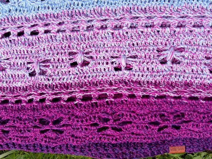 Das Tuch kann in jeder beliebigen Größe gehäkelt werden, da sich die Reihen wiederholen. Bitte beachte, wenn du eine andere Wolle verwendest, eine andere Nadelstärke, oder generelle lockerer/fester häkelst, kann die Größe variieren.