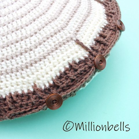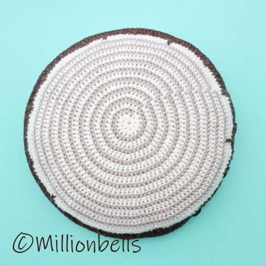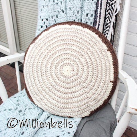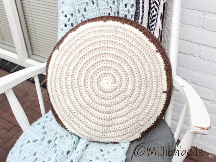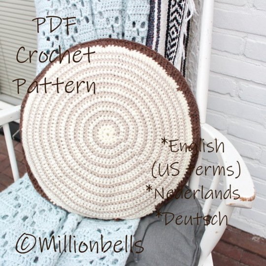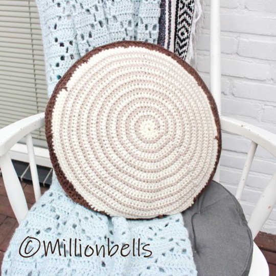 Mit dieser Anleitung häkeln Sie schnell und einfach, einen rustikalen Holzscheiben-Kissenbezug, wie abgebildet, aus doppelten Fäden Acryl-DK-Garn, mit Häkelnadel Größe 6 mm. Der fertige Durchmesser beträgt ca. 48 cm und passt für ein rundes Kissen ähnlicher Größe.