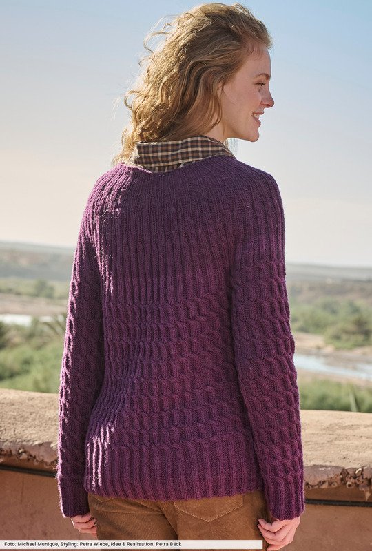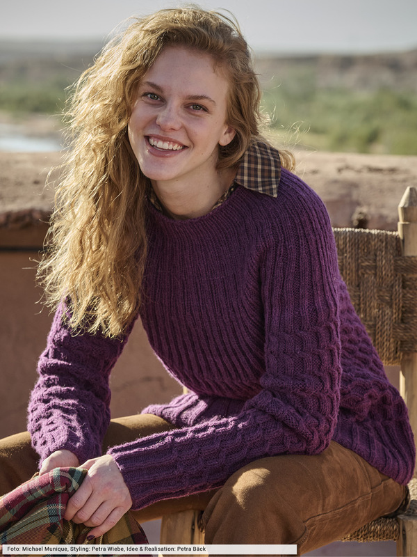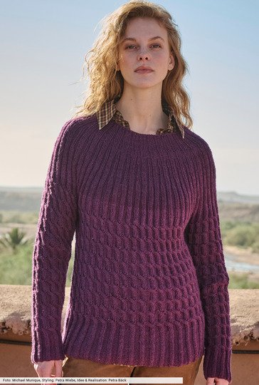 Dieser Zopf-Rippenpulli wird durch das Passen-Prinzip, also alle Teile separat stricken und auf Brusthöhe zusammenführen, plötzlich ganz modern. Und macht noch mehr Spaß beim Stricken, weil die Arbeit schnell von der Nadel geht und eine perfekte Passform garantiert ist. Probieren Sie es aus! Und die beste Nachricht: Das Garn – eine edle Kombination aus Schur- und Yakwolle – lässt in sanftem Aubergine die Strukturen toll zu Geltung kommen.