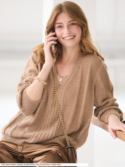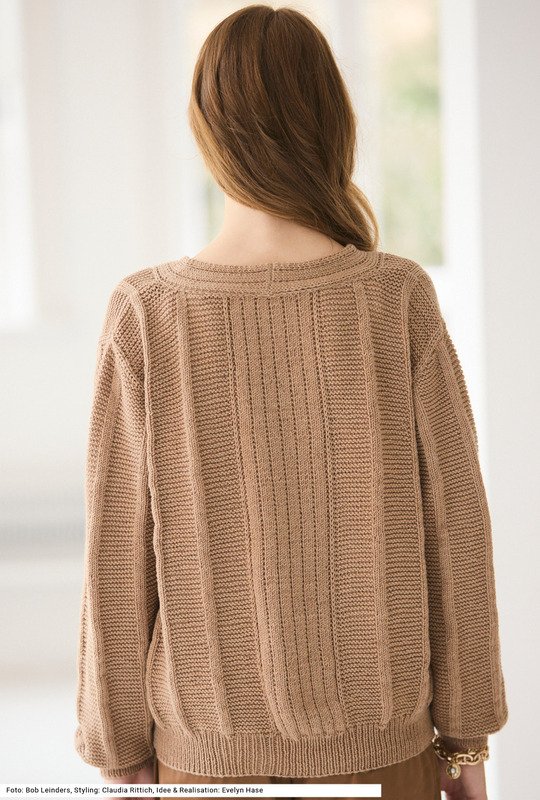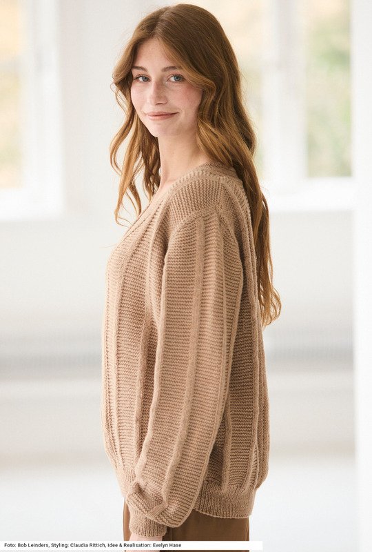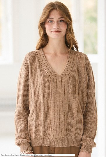 Dieser bequem oversized geschnittene Pullover mit V-Ausschnitt lässt sich perfekt kombinieren – mal mit kleinem Tuch, mal mit einer Bluse darunter oder einfach ganz ohne, um das Dekolleté zu zeigen. Und der dezente Mustermix aus glatten und krausen Längsstreifen trägt ebenfalls dazu bei, dass dein Outfit charmant aufgewertet wird. Dazu ein Garn aus reiner Schurwolle mit einer leichten Melange in den Farben. Der breite Streifen in der Vorderteilmitte läuft um den V-Ausschnitt und auch über den rückwärtigen Halsausschnitt weiter. Die Bündchen haben ein Rippenmuster. Eine Anleitung gibts für die Größen 36/38, 40/42 und 44/46.