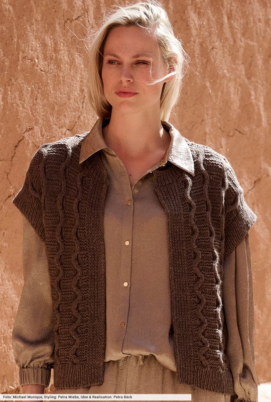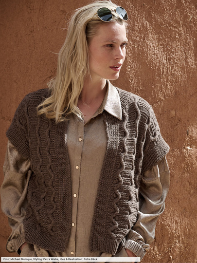 Einfach gestrickt, stark in der Wirkung – diese gerade geschnittene, verschlusslose Weste verdeutlicht, wie viel Stil in den Maschen stecken kann. Das Zickzack-Muster wird in der Anleitung genau beschrieben und lässt auch weniger versierte Strickerinnen zum Erfolg kommen. Das Finish bilden elastische Rippenbündchen, die sich sowohl an den Saumkanten, also auch an den Armausschnitten und als Halsblende in Szene setzen.