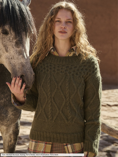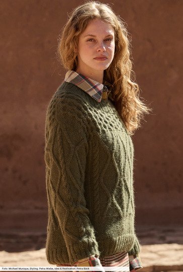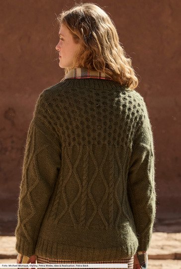 Wenn warmes Laubgrün auf traditionelle Muster-Optik trifft, ensteht daraus ein Look, der zugleich geerdet und stilvoll ist. Die Zopf-Rauten-Strukturen in der Mitte und an den Ärmeln werden im Schulterbereich mit einem markanten Wabenmuster kombiniert – das sieht nicht nur toll aus, sondern ist ganz sicher nicht von der Stange zu kaufen. Das edle Alpakagarn gibt die edle Note und garantiert den hohen Tragekomfort.