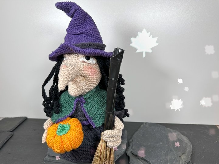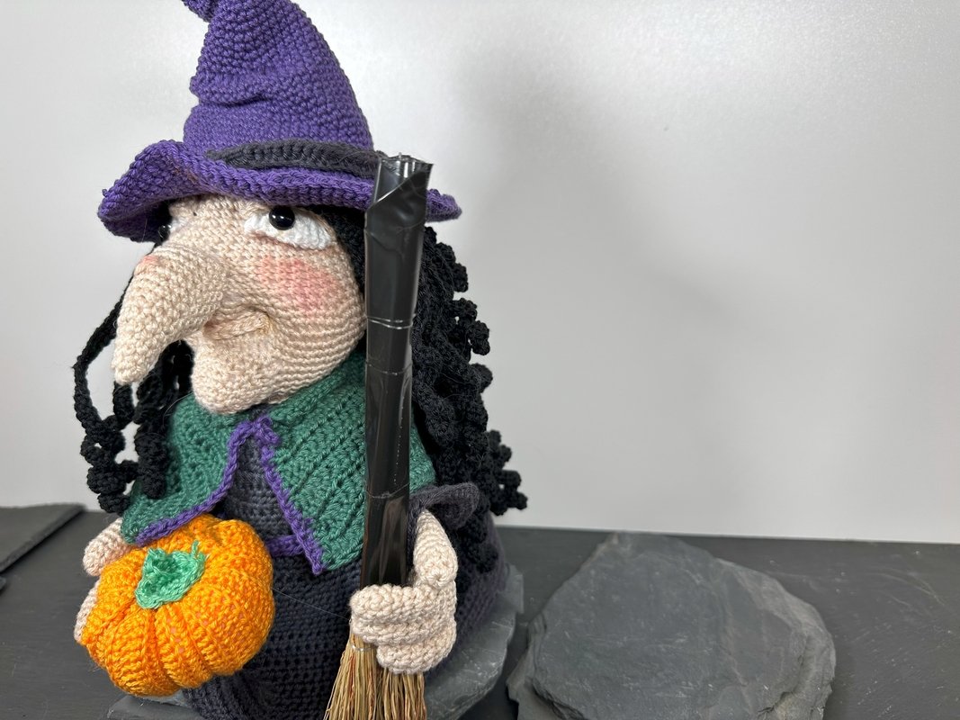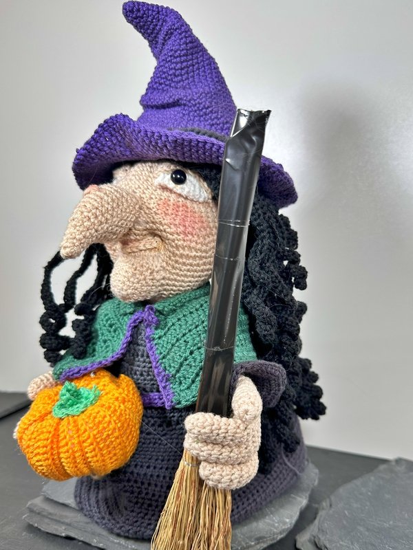 Ihr kauft hier eine Häkelanleitung für die Hexe. Ebenfalls in der Anleitung enthalten ist der Kürbis. Nicht enthalten ist der Besen. Der ist gekauft, und in der Anleitung steht wo.