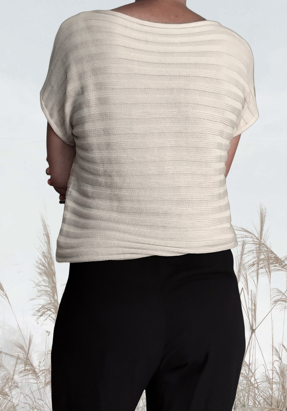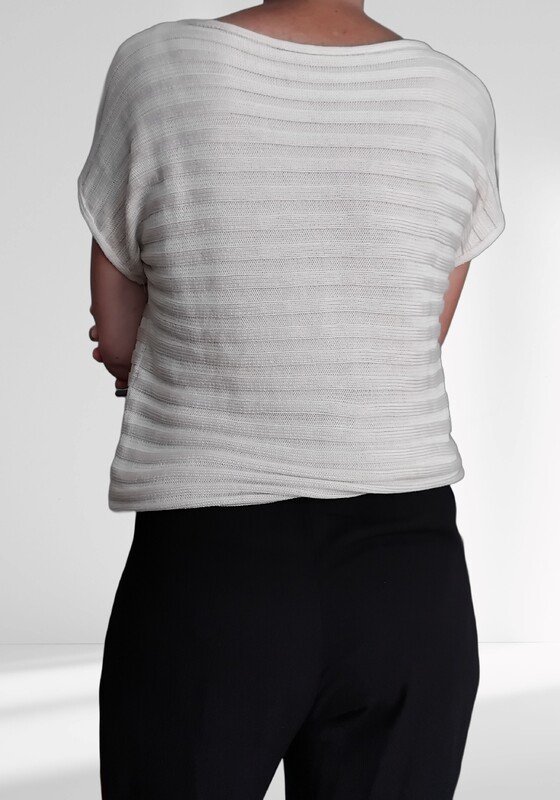 Ein leichtes Top quer gestrickt, im klassischen Rippenmuster mit kurzen Ärmeln, für einen lässigen und dennoch eleganten Look. Das Bambusgarn sorgt für einen seidigen Glanz, angenehme Kühlung und ein besonders weiches Tragegefühl. Die seitliche Strickrichtung verleiht dem Modell eine moderne, raffinierte Note. Ob zur Jeans oder zum Rock – dieses Top ist ein vielseitiger Begleiter mit Stil und Komfort.