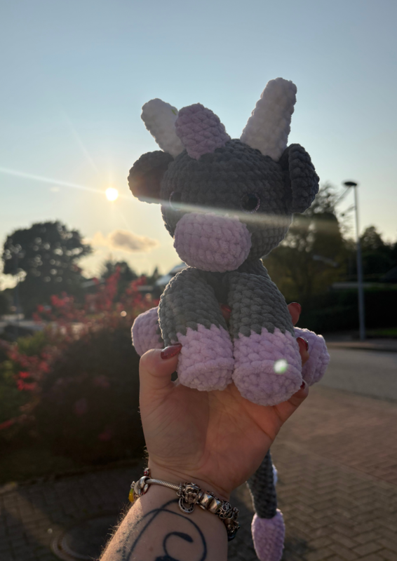 • Vorderbeine werden direkt eingehäkelt, Hinterbeine, Schwanz, Hörner, Ohren, Rückenzacken und Schnauze werden separat gehäkelt und angenäht