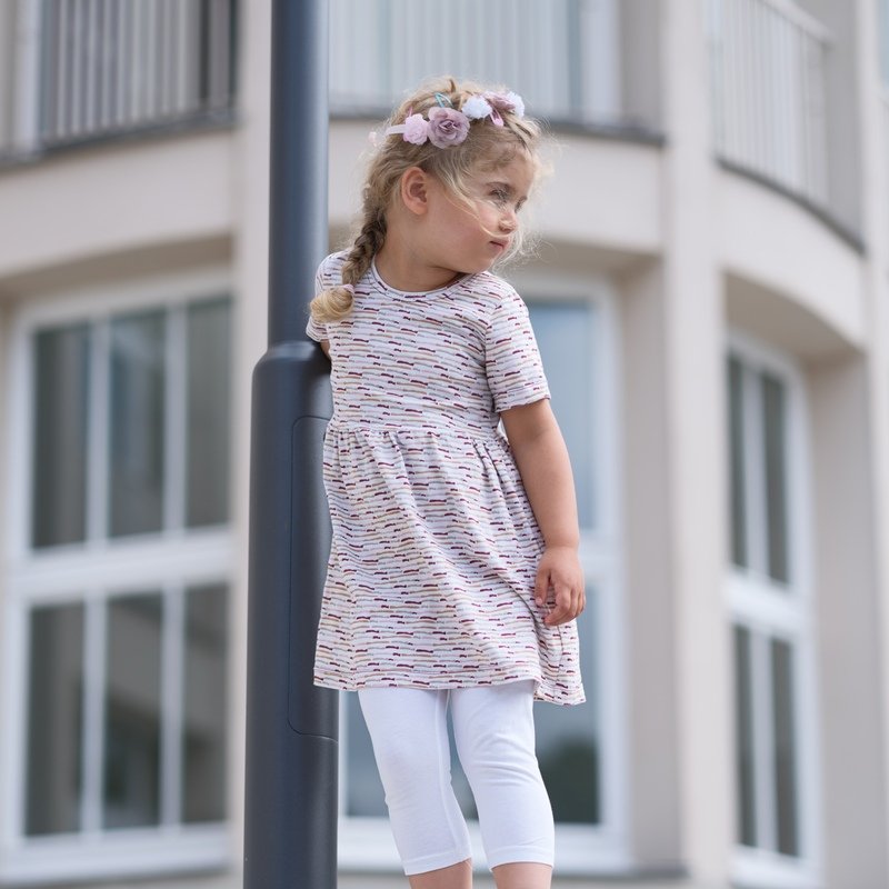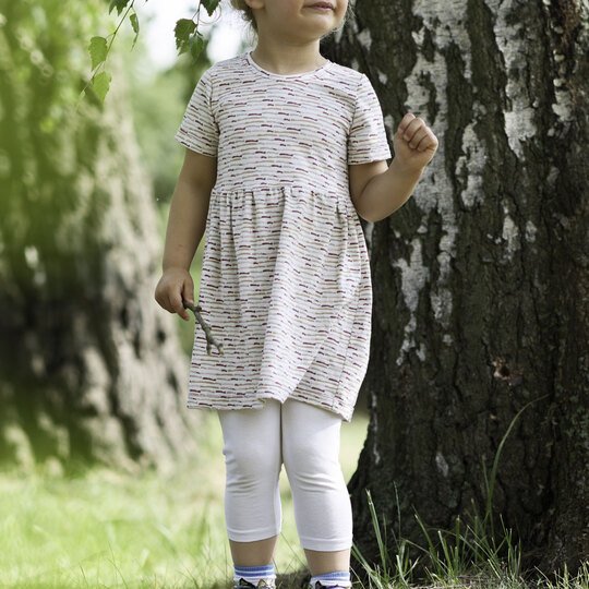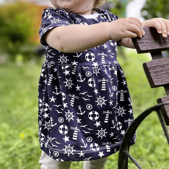 Das Shirtkleid sitzt locker, hat einen angenehmen Shirt-Charakter und endet in der Kleid-Version über dem Knie – perfekt für kleine Entdecker. Es ist ideal für Jersey, Sommersweat oder andere dehnbare Stoffe.