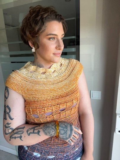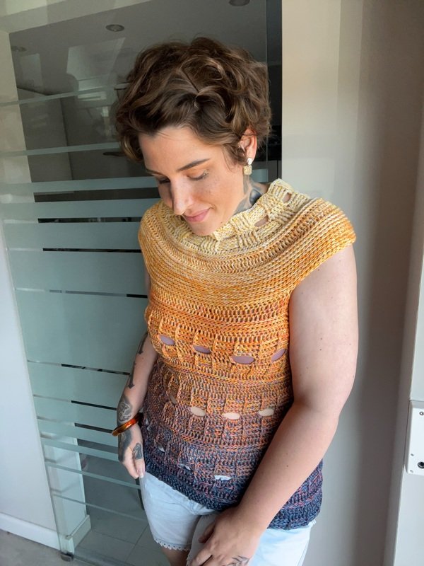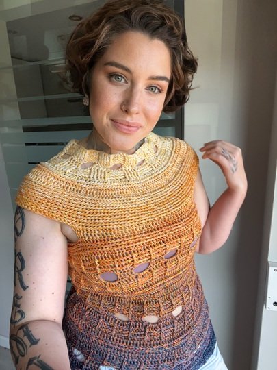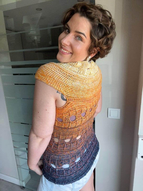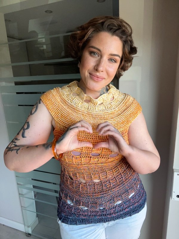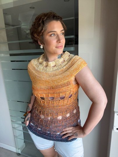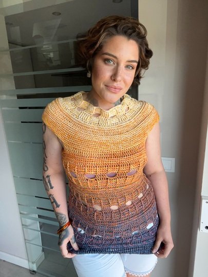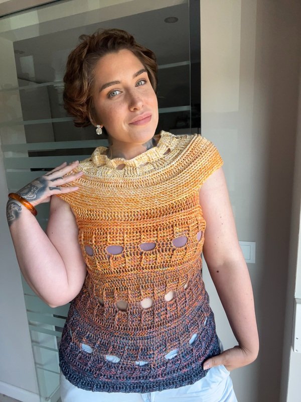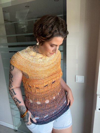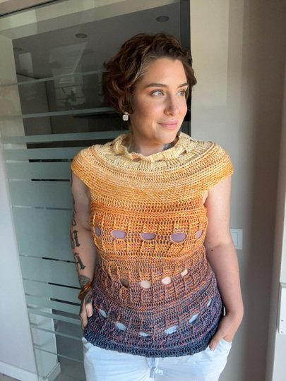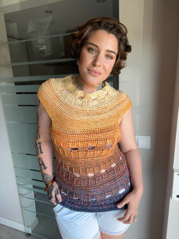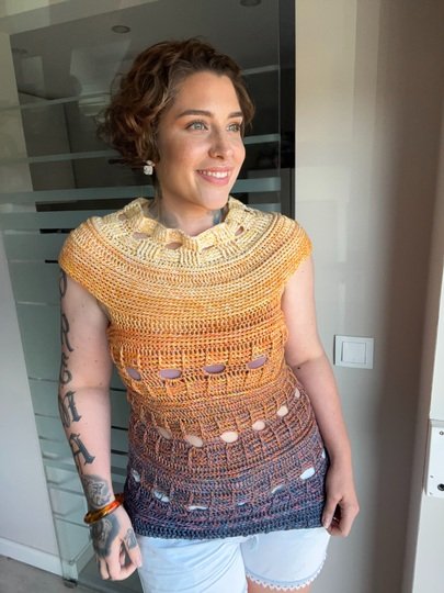 Mit meiner neuen Häkelanleitung entsteht ein sommerliches T-Shirt, das sofort gute Laune macht und in jedem Kleiderschrank ein Hingucker ist. Das Modell trägt den Namen JEANS SUNSET, weil es mit seiner Struktur und dem abwechslungsreichen Muster perfekt zu Jeans passt und gleichzeitig die Leichtigkeit und Farben des Sommers einfängt.