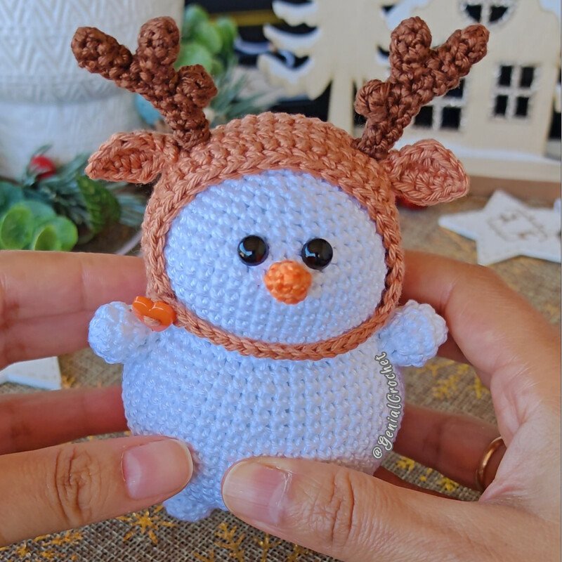 Die Häkelanleitung erfordert nur minimales Zusammennähen: Kopf und Körper werden in einem Stück gehäkelt, Beine und Arme werden während der Arbeit mit festen Maschen eingehäkelt. Anschließend bleibt nur noch, die Nase sowie die Geweihe und den Knopf an der Mütze anzunähen.