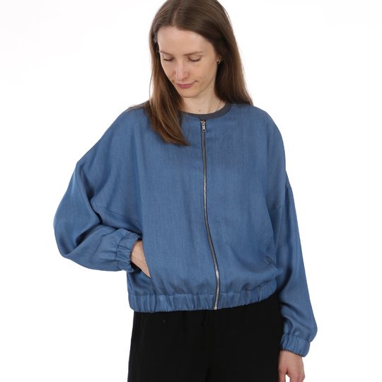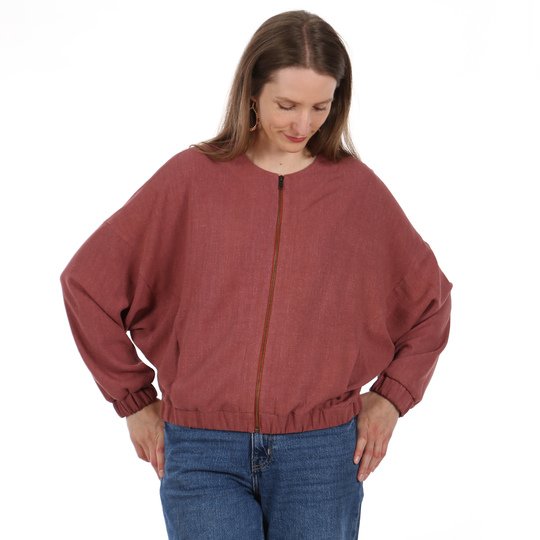 FRAU KORA ist ein echtes Style-Statement: Die tief angesetzten Fledermausärmel machen sie zum absoluten Eyecatcher. Markante Teilungsnähte mit integrierten Taschen bringen Struktur ins Design, während der kragenlose Schnitt und der Reißverschluss für eine klare, moderne Linie sorgen. Breite Gummibündchen an Ärmeln und Saum verleihen der Jacke einen coolen, lässigen Abschluss.