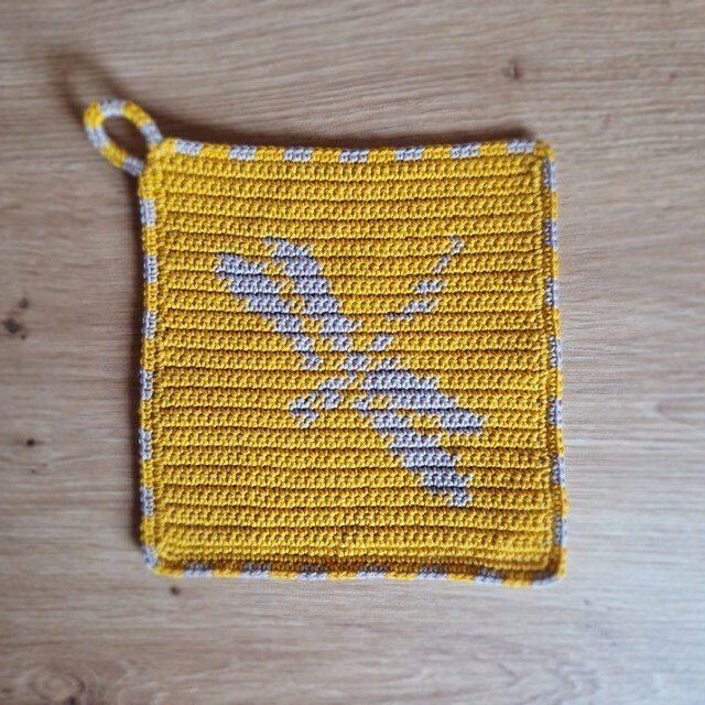 Mit der von mir verwendeten Wolle hat der Topflappen eine Größe von ca 20cm x 20cm