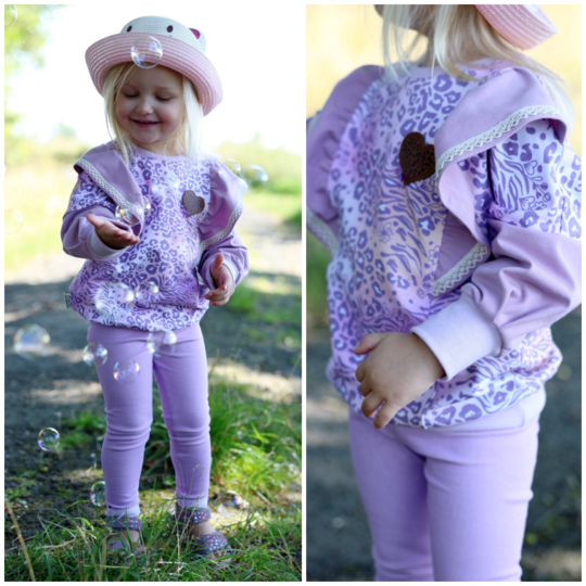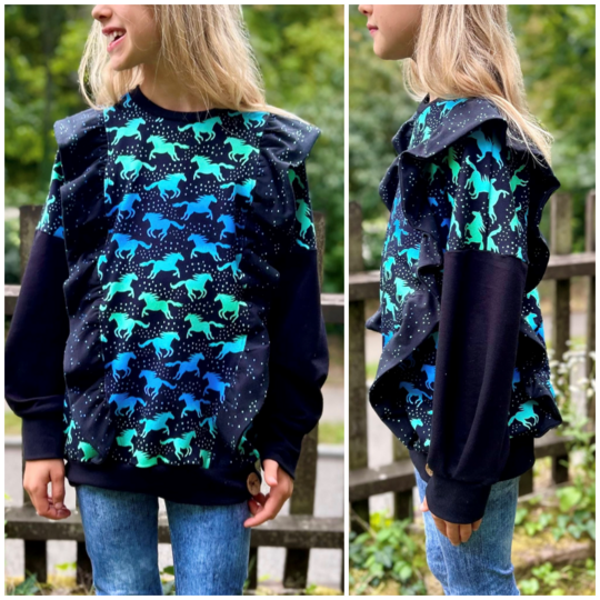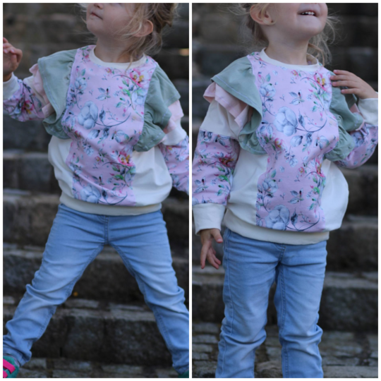 Bubblegum ist gemacht zum Wohlfühlen. Ein Sweater, der unsere Mädels im Alltag begleitet, übergeworfen werden kann wenn es bequem sein soll und trotzdem - es gibt so tolle Highlights beim Schnittmuster, dass aus jedem Werk etwas Besonderes wird. Das ballonartig, bzw. leicht ausgestellt (es gibt zwei Linien) geschnittene Schnittmuster mit seinen überschnittenen Schultern verfügt über eine lockere, angenehme und lässige Passform und wird mit Bündchen an allen Abschlüssen genäht. Der Halsausschnitt ist ein Rundhalsausschnitt, der ebenfalls mit einem angenehmen Bündchen genäht wird. Die Highlights des Schnittes beginnen bei den optionalen Teilungen. So sind nicht nur totale Basicvarianten möglich, sondern mit zwei Teilungen auf Front- und Rückseite kann richtig viel angestellt werden. Hier können verspielte Rüschen in verschiedenen Varianten entweder nur auf der Front oder über Front- und Rückseite angebracht werden. Es gibt eine kurze Rüschenversion und eine lange Rüschenversion - natürlich können die beiden Versionen auch kombiniert werden. Ergänzt werden diese tollen Möglichkeiten durch vier verschiedene Ärmel - eine kurze Ärmelversion, eine normale, lange Ärmelversion, ein am Abschluss geraffter Ärmel oder ein Ärmel mit Kellerfalte am Abschluss.