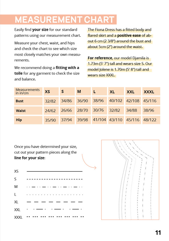 Das Jersey Midikleid Schnittmuster hat eine Mehrweite von 6cm auf Höhe der Brust und 5cm auf Höhe der Taille. Als Referenz: Unser Model Djamila ist 170m groß und trägt Größe S. Das KI-Model Jolene ist 1,73m groß und trägt Größe XXXL.