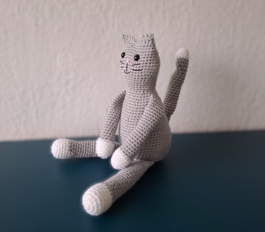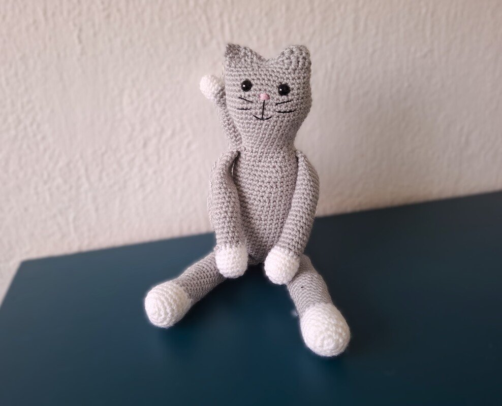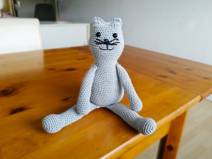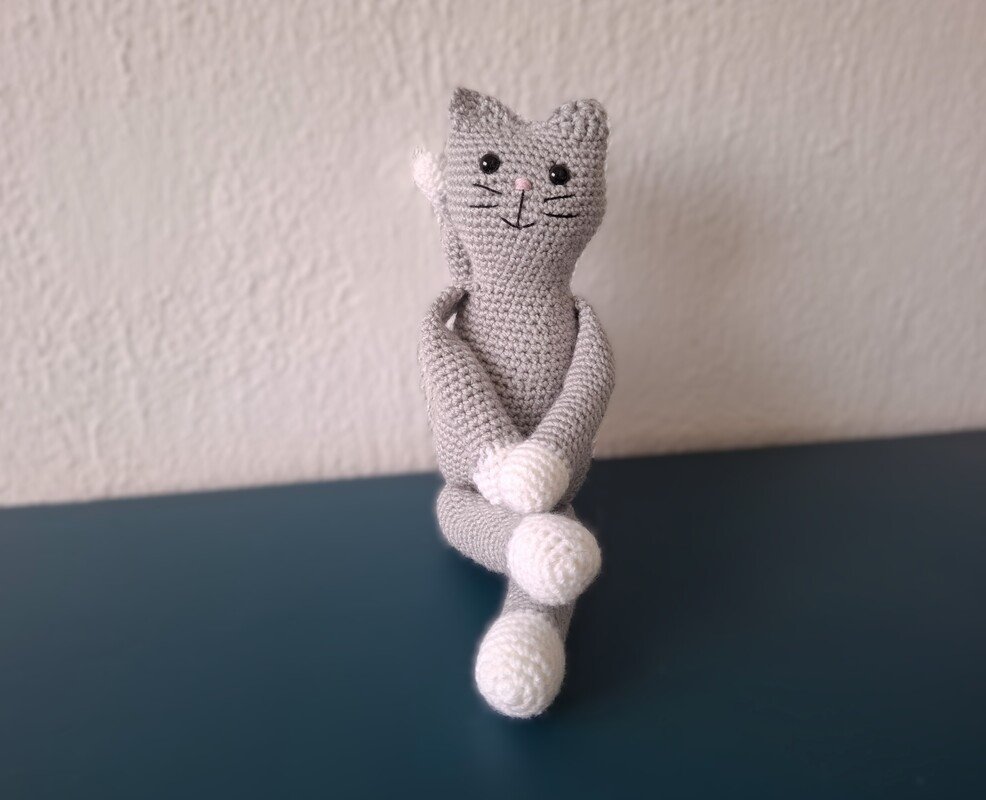Katinka wird als Kantenhocker gearbeitet. Wenn sie nicht gerade als Kuscheltier im Einsatz ist, bietet sie auf dem Regal einen hübschen Blickfang.