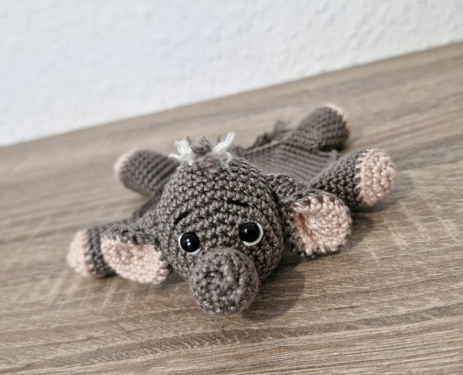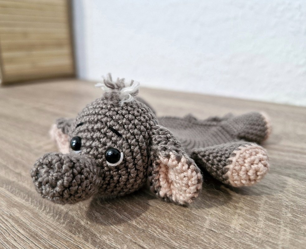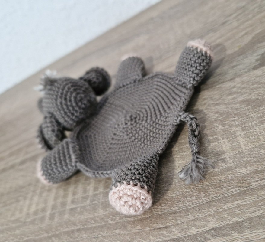 Die Anleitung umfasst mehrere Teile: Untersetzer, Kopf mit Rüssel, Beine, Schwanz, Haare, Ohren.