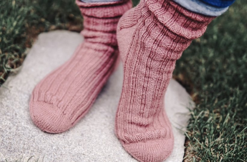 Du strickst sie „Toe-up“, beginnst also an der Spitze. Am Fuß ist das Rippenmuster nur auf der Oberseite, so stört auch nichts beim Laufen. Nachdem du die Hufeisenferse gestrickt hast, beginnst du mit einem Streifen des Rippenmusters auf der Rückseite des Sockenschaftes. Ein optionales Umschlagbündchen rundet deine Socken ab.