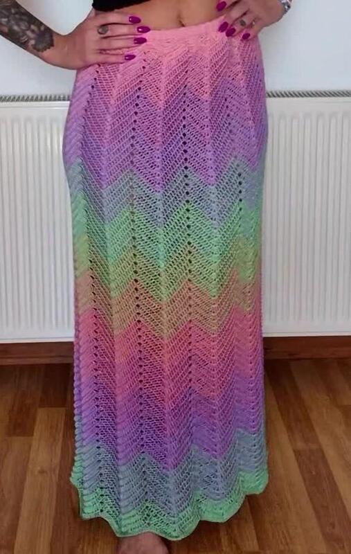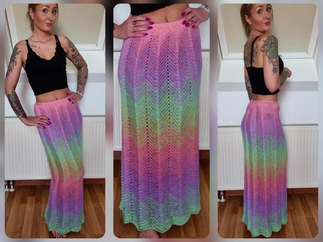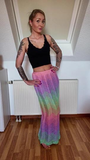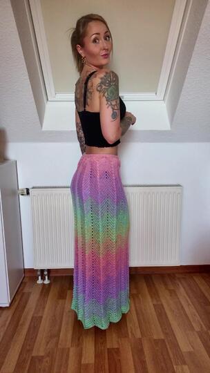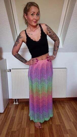 Der Rock wird an einem Stück gehäkelt und ist daher bestens für Farbverlaufsgarn geeignet. Es geht natürlich auch jede andere Art von Wolle.