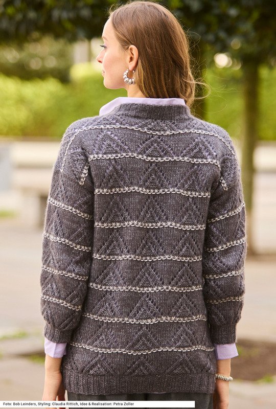 Abwechslung bringen bei dieser Jacke mit V-Ausschnitt nicht nur die unterschiedlichen Muster, nein, auch insgesamt dreierlei Garne kommen hinzu. Zwischen den Ajourmusterstreifen, die mit zweierlei Garnen zweifädig gestrickt werden, gibt es schmale Streifen im Hebemaschenmuster mit einem Faden aus dem dritten Garn. Das Gestrick ist herrlich anschmiegsam; das liegt daran, dass die drei eingesetzten Qualitäten aus hochwertigen Fasern aus Mohair-, Kaschmir- und Seidenmischungen bestehen. Alle Bündchen und die Vorderteilblenden mit Knopfleiste werden im 2/2-Rippenmuster gearbeitet. Die Anleitung dazu gibt es für die Größen 38/40 und 46/48.
