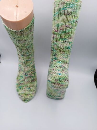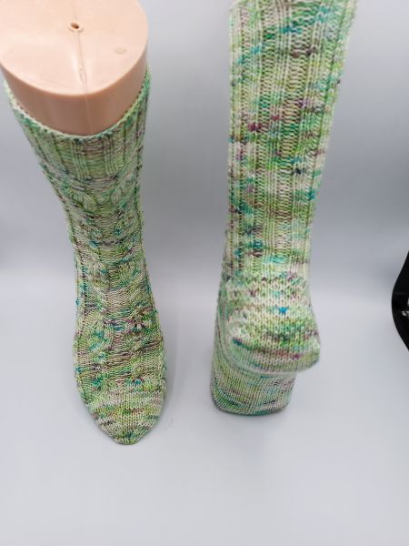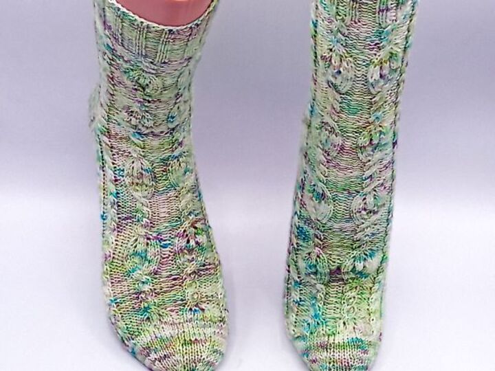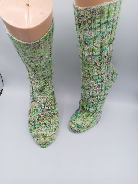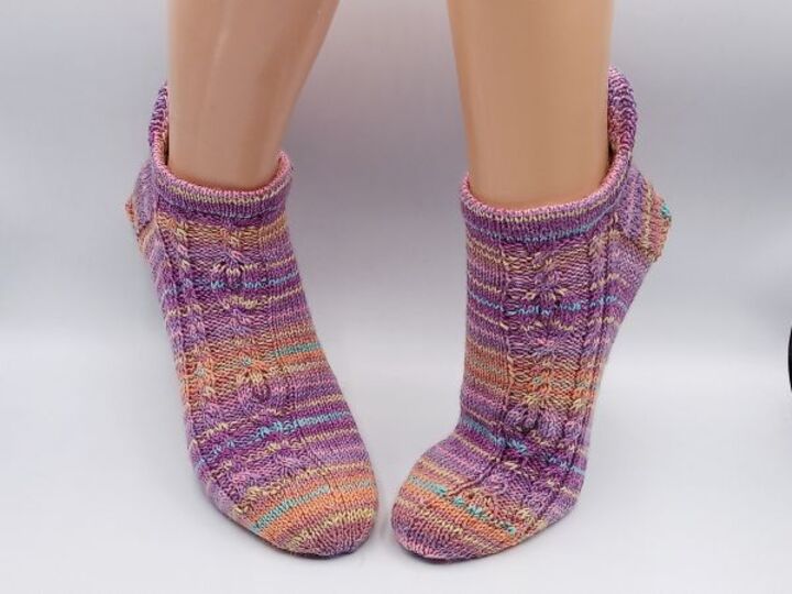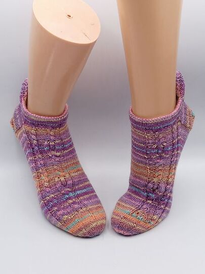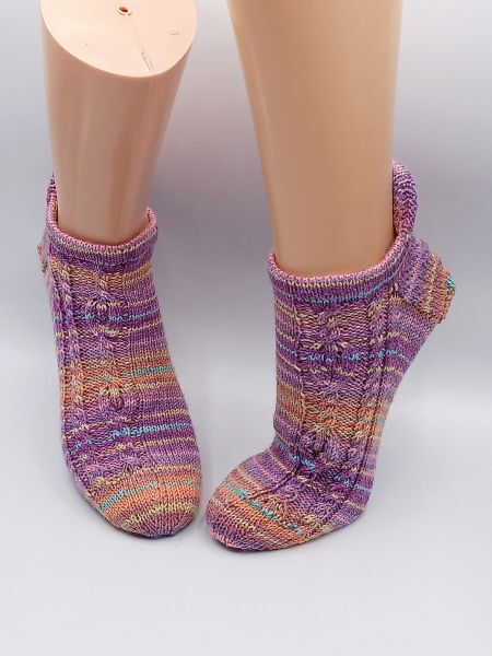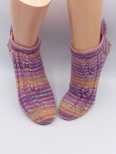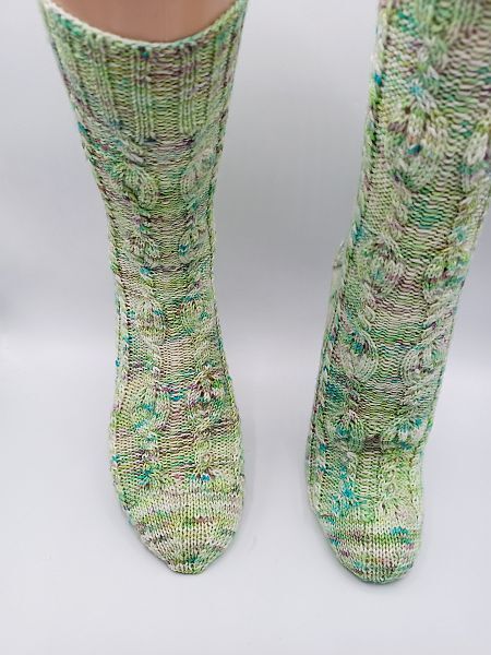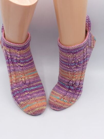 Diese Sockenanleitung zeigt ein schönes Muster mit Verzopfungen und kleinen Flammen. Die Flammen sind von linken Maschen umrahmt. Das Muster passt zu den Maschenzahlen 56, 60, 64, 68 und 72.