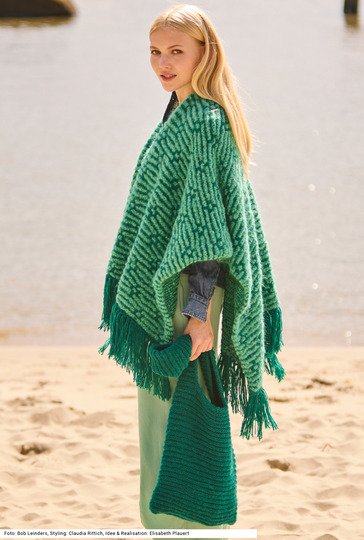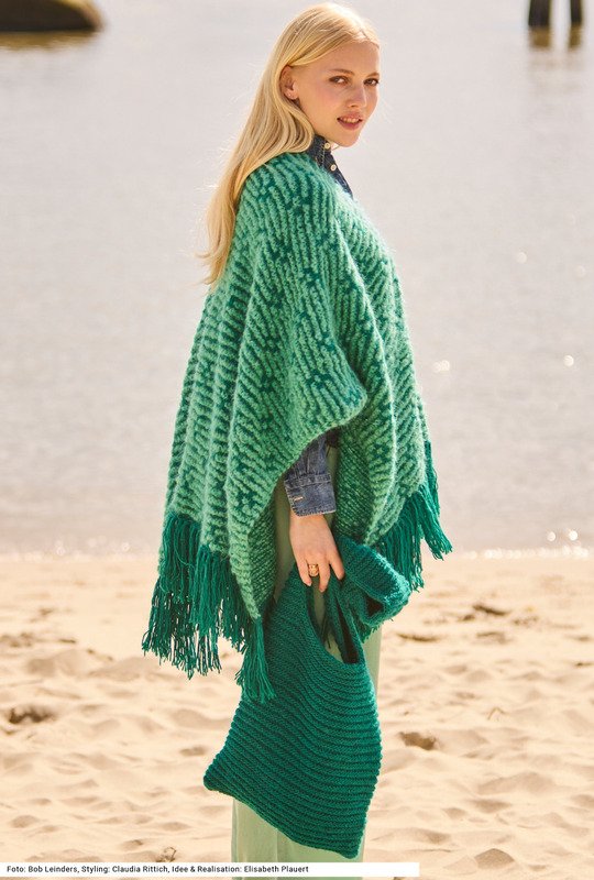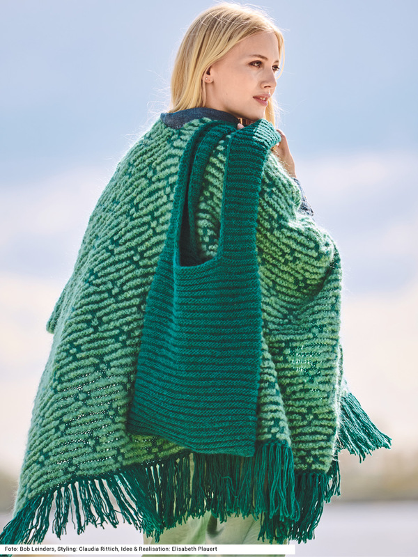 Bei diesem Duo kommen zwei Garne für den Poncho und eines davon für die Tasche zum Einsatz. Das flauschige für die hellere Farbe aus Polyacryl, Mohair, Wolle und Polyamid, das glatte für die dunklere aus Polyacryl und Wolle. Für den Poncho wird ein Hebemaschenmuster gestrickt und am Schluss noch Fransen angeknüpft. Die äußeren Ränder und der Halsausschnittrand haben einen I-Cord als Begrenzung. Für die Tasche gibt es ein dezentes Querrippenmuster, das aus glatt rechten und glatt linken Reihen besteht. Eine Anleitung gibt es für den Poncho in Einheitsgröße, die Tasche ist 32 x 30 cm groß.