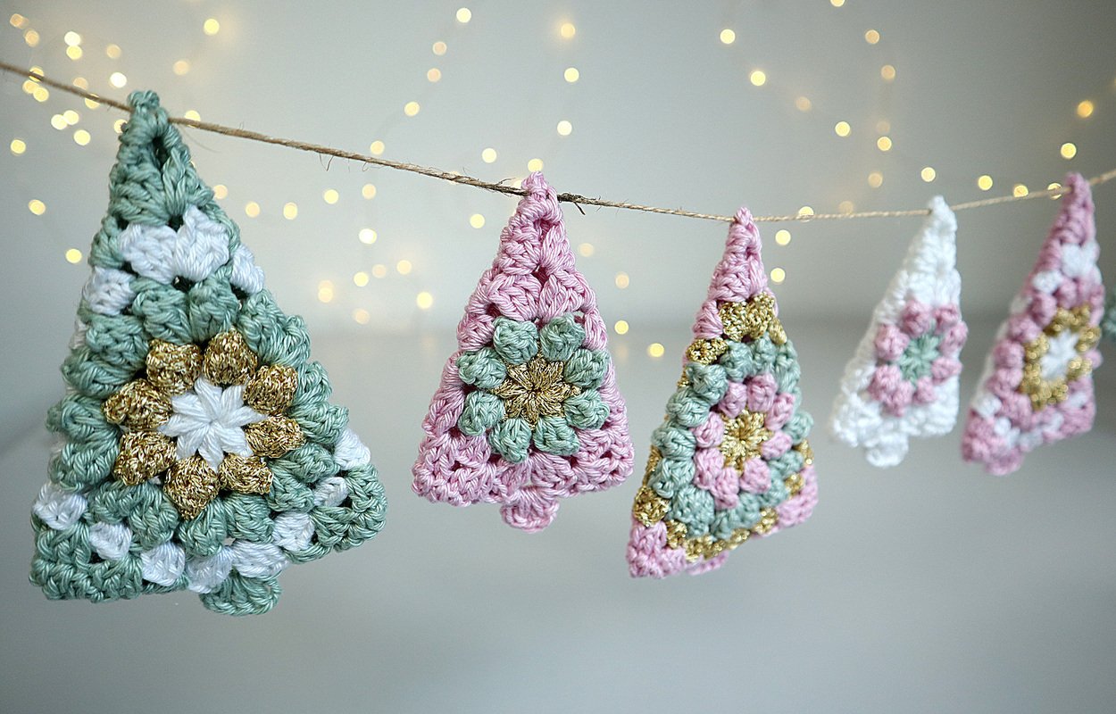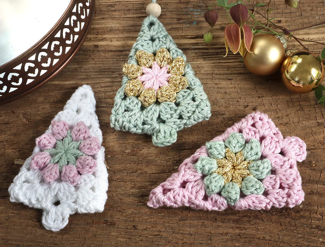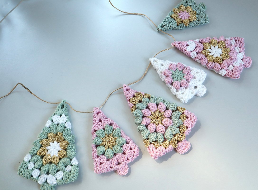 Zaubere dir stilvolle Weihnachtsdeko mit diesen schnell gemachten Granny-Bäumchen! Ob als Geschenkanhänger, Christbaumschmuck oder festliche Girlande – die zarten Pastellfarben kombiniert mit einem Hauch Goldglanz sorgen für eine moderne und elegante Weihnachtsstimmung.