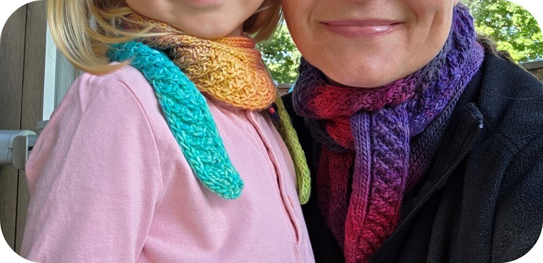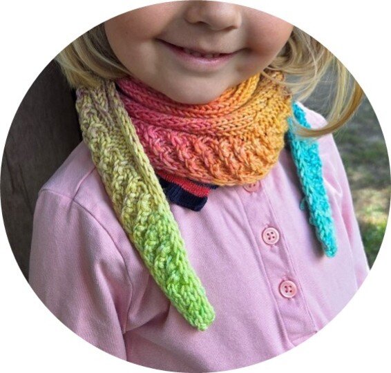 Das Kindermodell ist als Miniscarf aus 50g DK Garn gestrickt. Diese Größe ist in der Anleitung nicht extra beschrieben. Das Garn entsprechend anpassen.