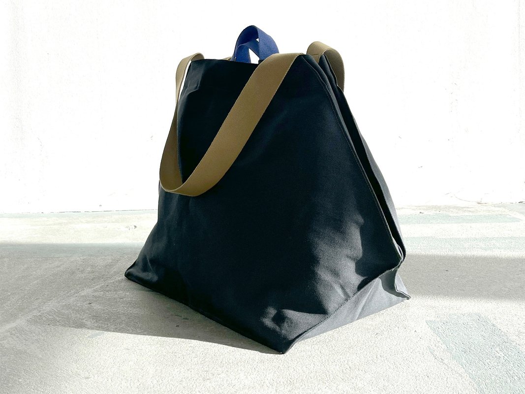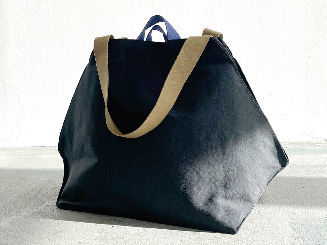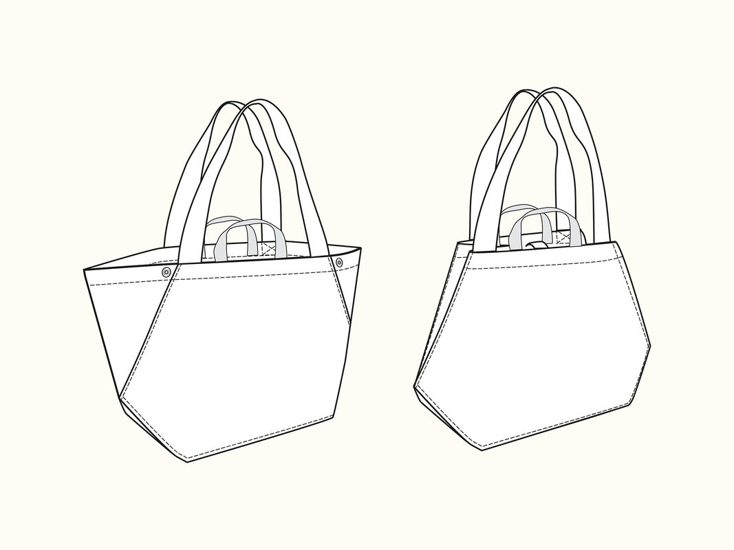 Ein Schnittmuster und eine Anleitung für eine Einkaufstasche mit origamiartiger Faltung. Die Sunday Tote hat einen grafischen Schnitt und kann ihre Form und ihr Volumen ändern. Wenn du die Seiten nach innen schlägst und mit den Druckknöpfen befestigst, bekommt der Taschenkörper eine Diamantform.