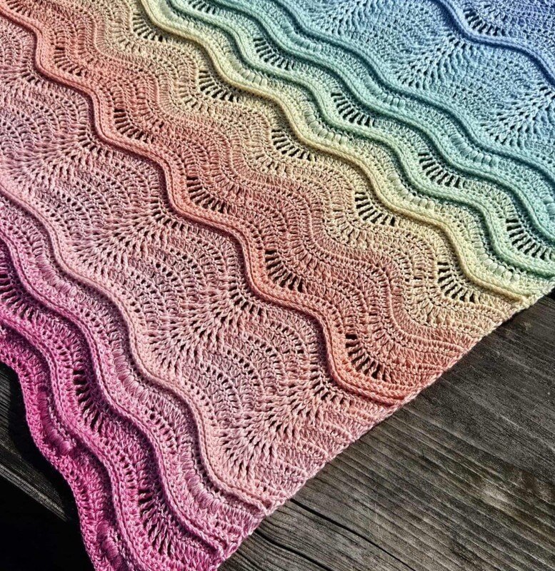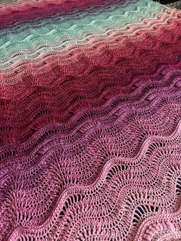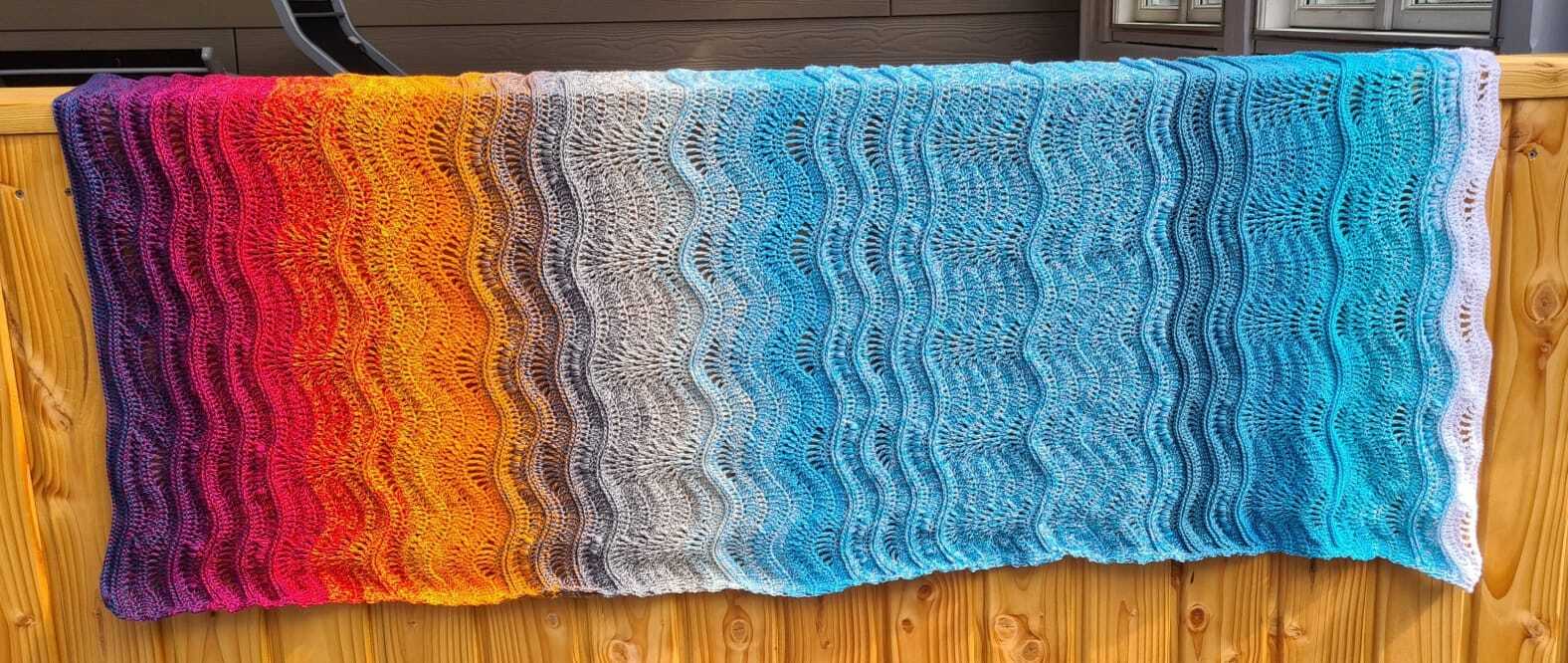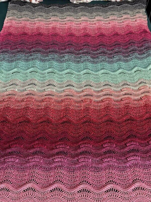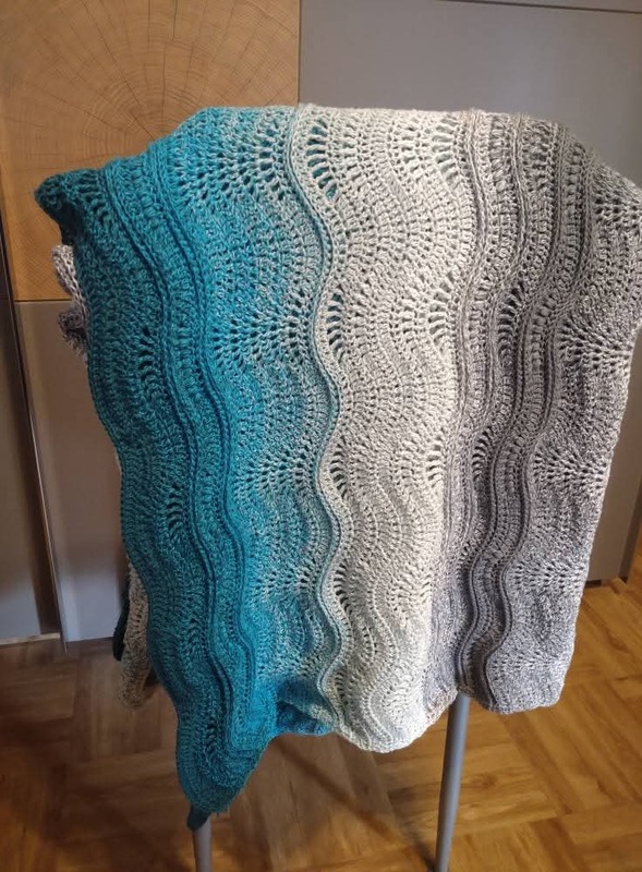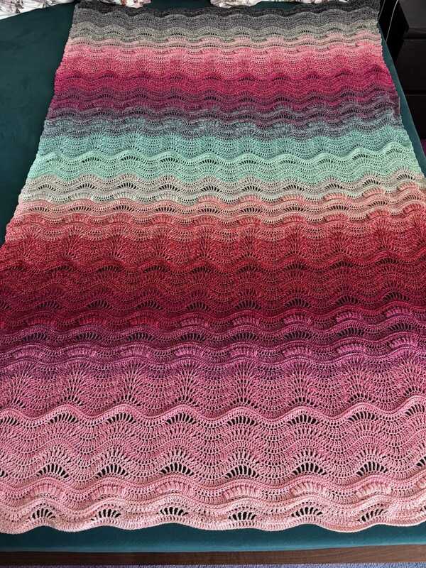 Ihr erhaltet hier eine Anleitung für eine Wellendecke oder auch eine Stola in Reihen. Sie ist beliebig vergrößert.