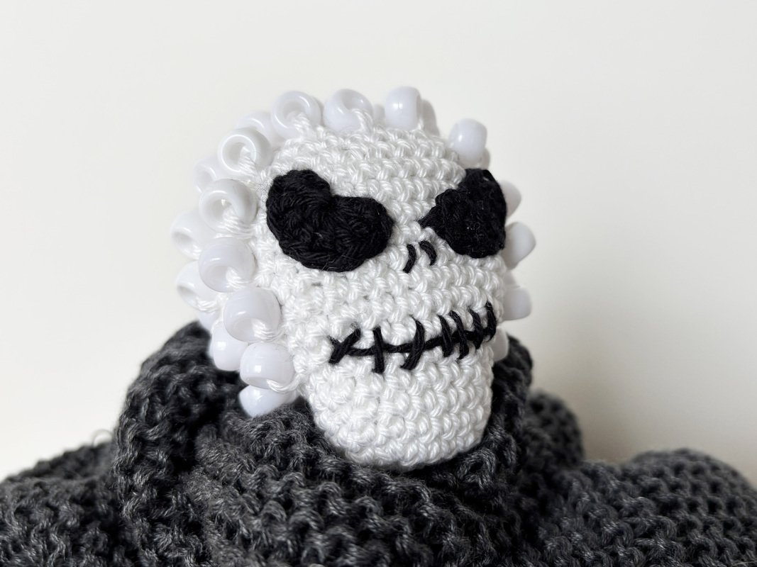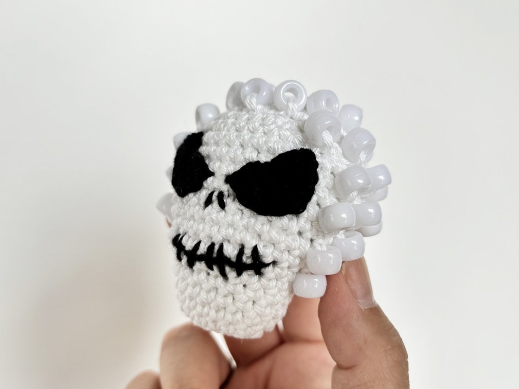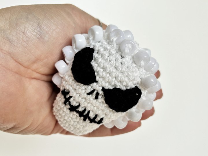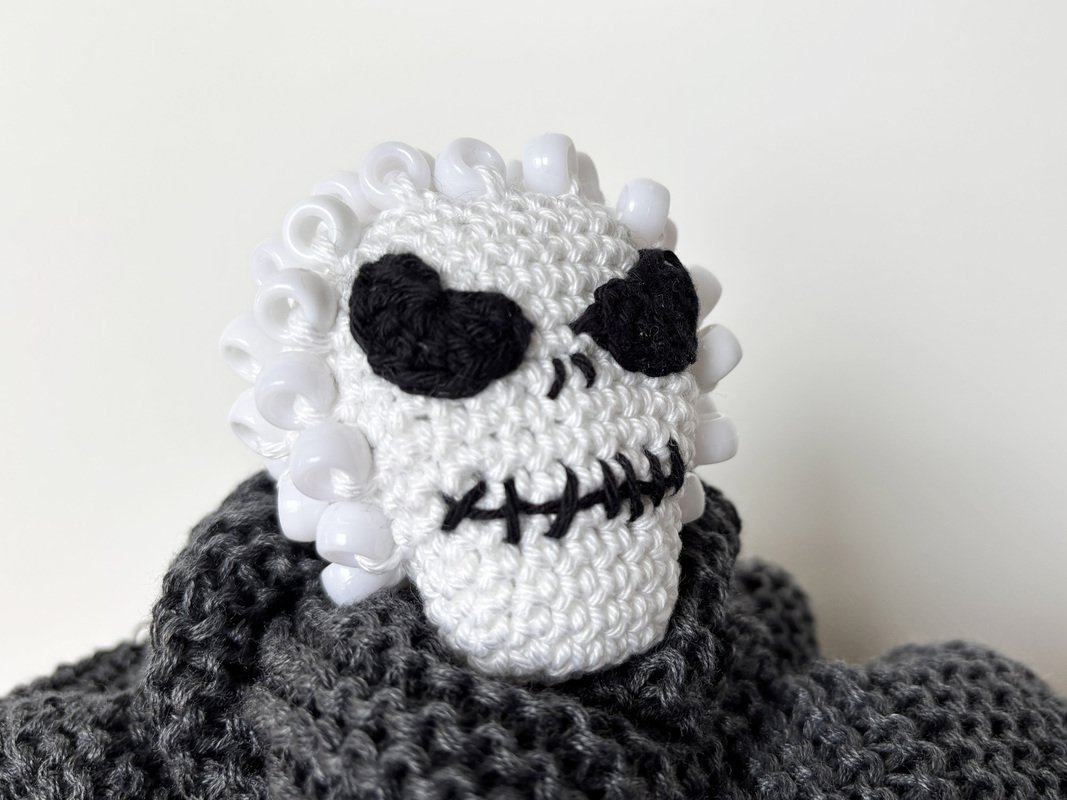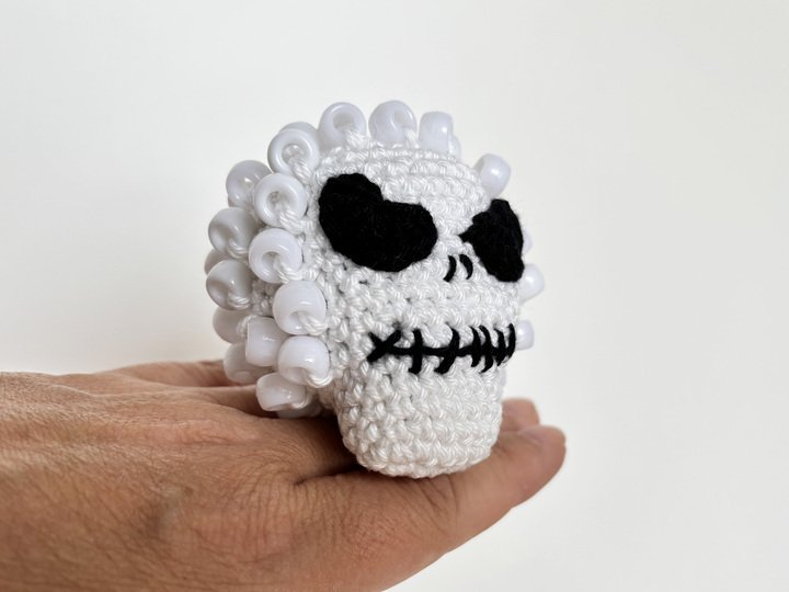 Mit diesem Artikel erhältst du eine vollständige Häkelanleitung (PDF) für einen gruseligen Amigurumi Totenkopf Schädel mit eingehäkelten Perlen und einem schaurigen aufgestickten Lachen.