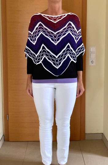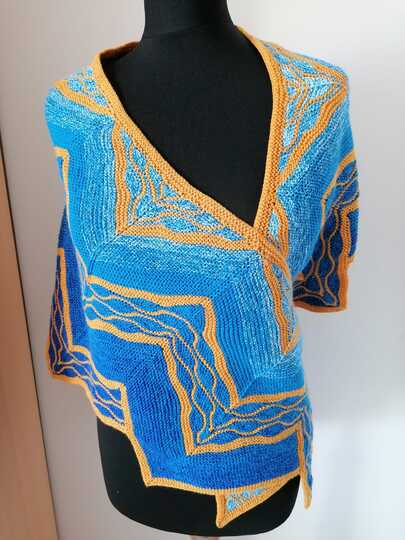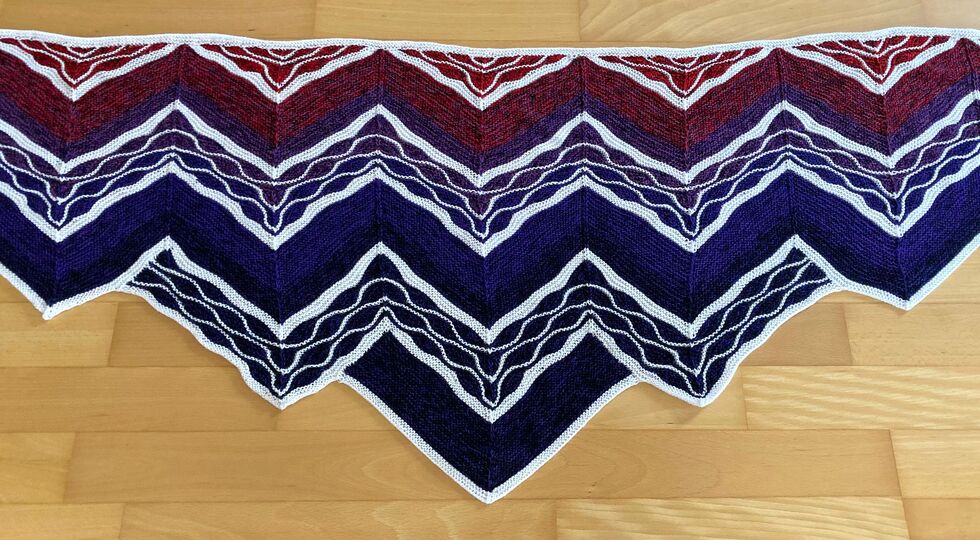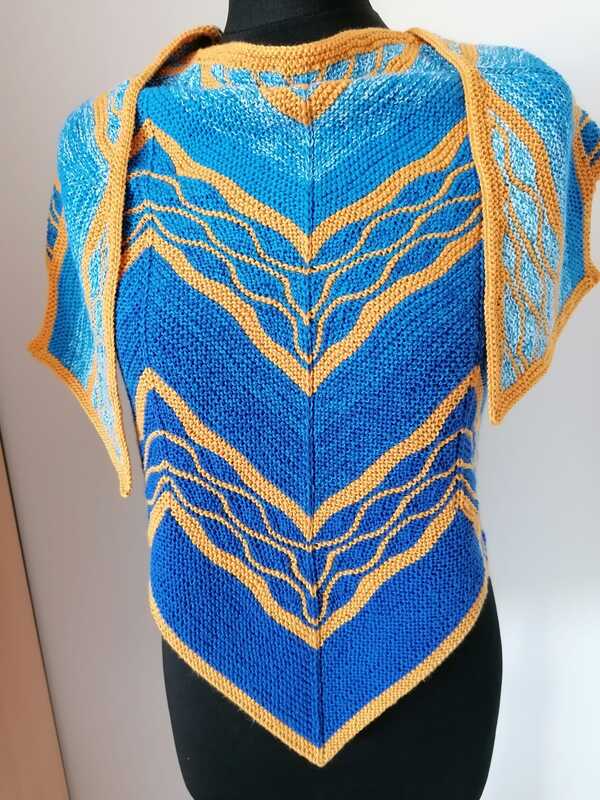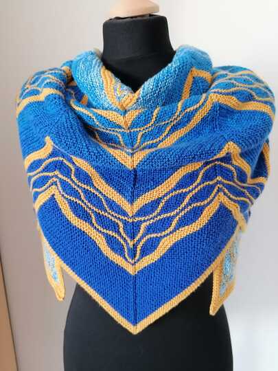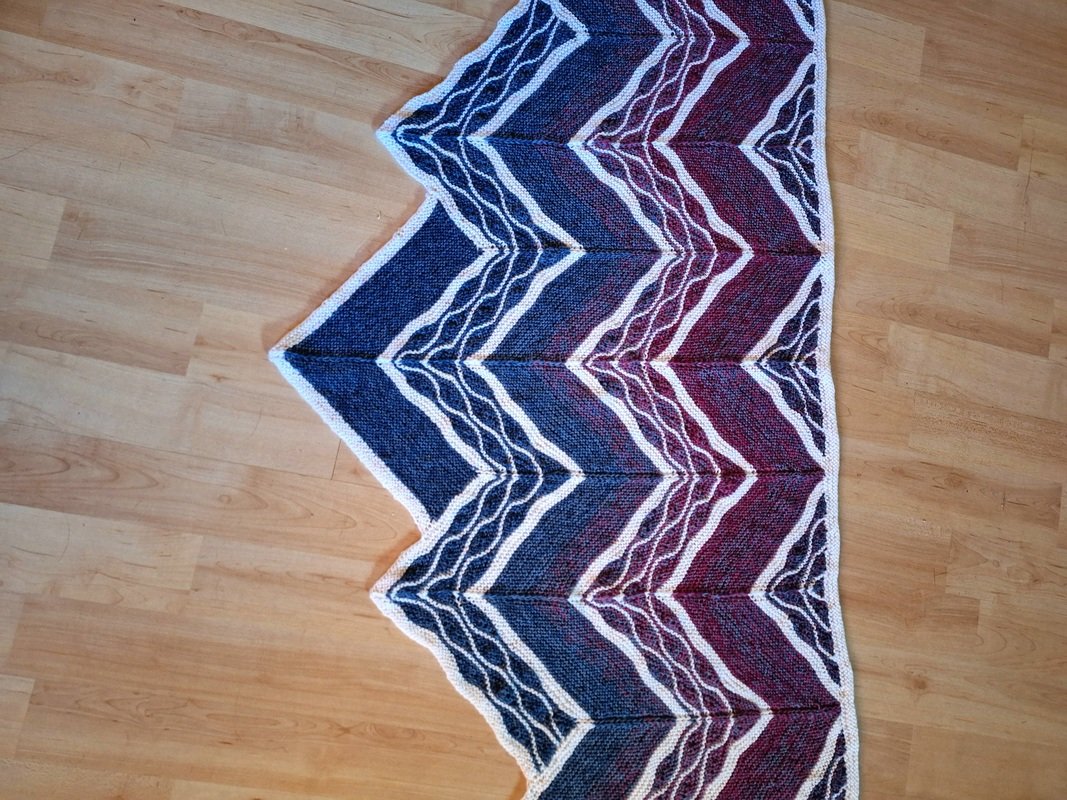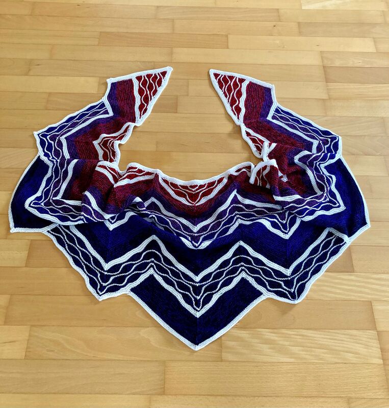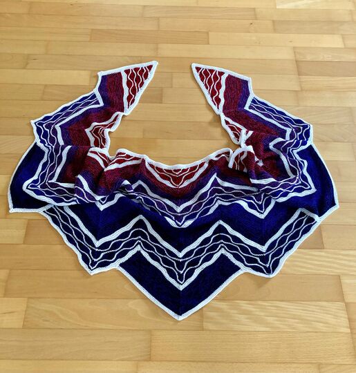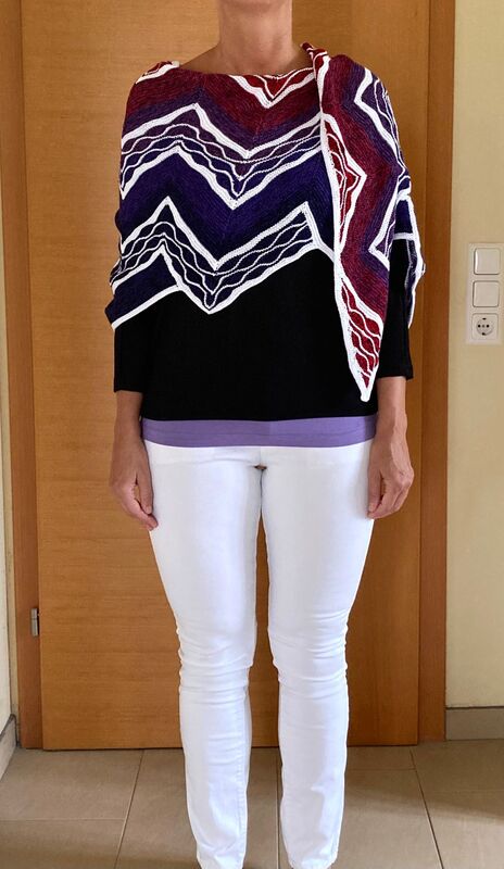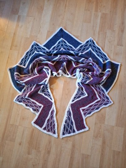 Es ist ein flaches gleichschenkeliges Dreieckstuch mit vielen verkürzten Reihen.