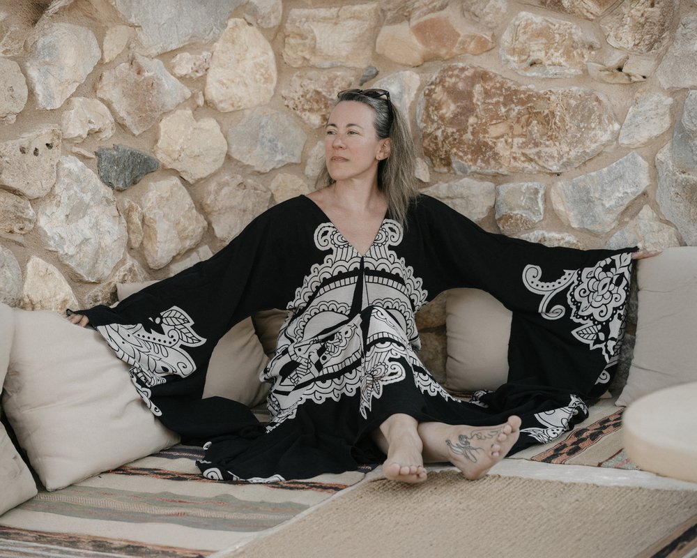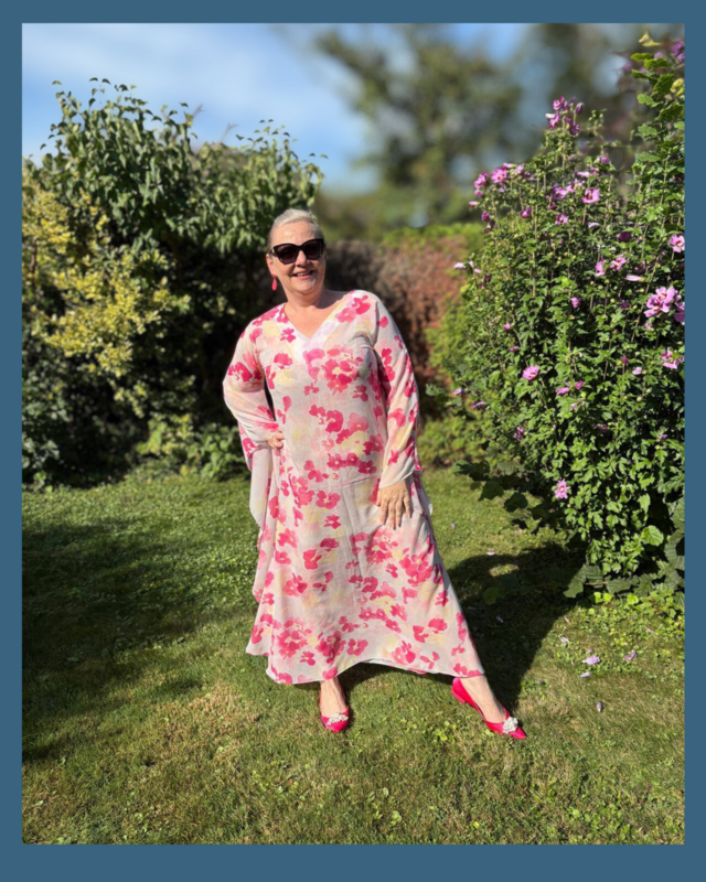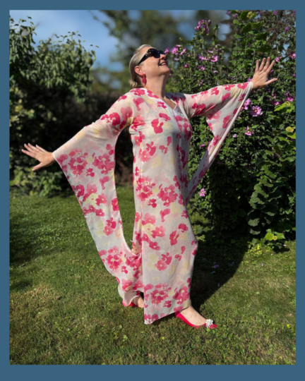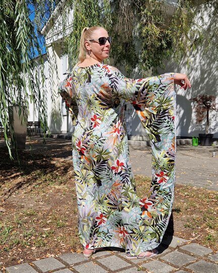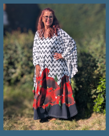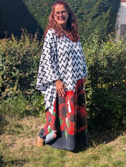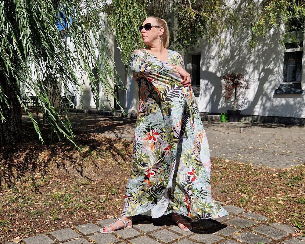 Variante 2: Ebenfalls ein langer Kaftan, großzügig geschnitten, klassisch und stilvoll – zugleich schnell und einfach zu nähen. Ideal als Hauskleid oder als leichter Überwurf für Strand, Garten und Freizeit.