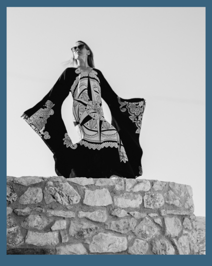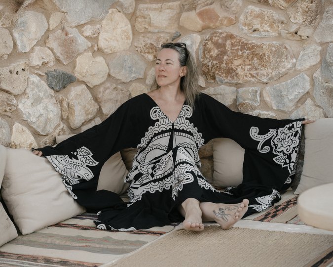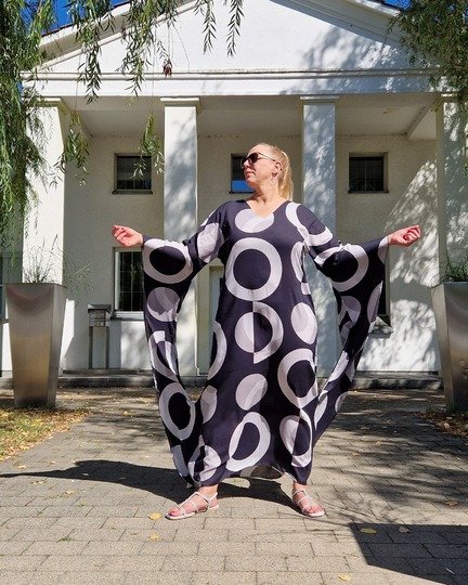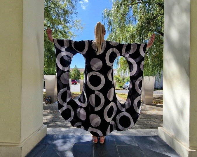 Durch die markanten Cut-outs unter den Armen entstand so ein völlig neues Modell, das mich sofort begeistert hat. Mit Nadjas Einverständnis habe ich daraus ein eigenständiges Schnittmuster entwickelt – einen Kaftan in zwei Varianten: