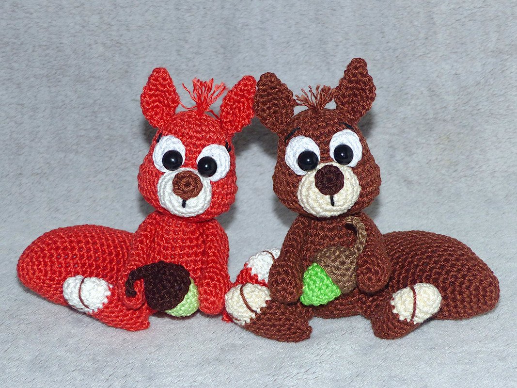 Solltet ihr eine komplett andere Wolle nehmen dann beachtet bitte: Je nach Garn- und Häkelnadelstärke variiert die Größe von den Eichhörnchen.