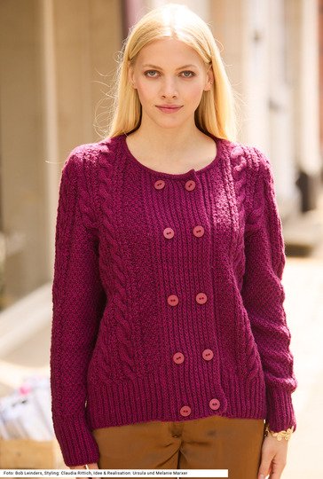 Was für ein gelungener Mustermix – ideal für alle, die Abwechslung beim Stricken lieben. Die doppelte, einzeln gestrickte Knopfleiste mit zehn Knöpfen dieser Jacke ist im Halbpatent gearbeitet, wie auch die Bündchen am Saum und an den Ärmeln. Die Mustervielfalt setzt sich zusammen aus schmalen und breiteren Zöpfen und Streifen im großen Perlmuster. Nach dem Annähen der Knopfblenden wird um den runden Halsausschnitt ein I-Cord gearbeitet. Das superweiche Garn ist aus Schurwolle und Yak. Eine Anleitung gibt es für die Größen 40/42, 44/46 und 48/50.