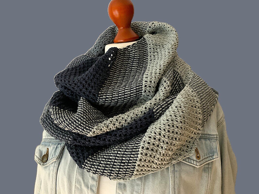 Es hat eine Größe von ca. 40 cm (breit) x 240 cm (lang). Andere Größen sind einfach möglich, indem man „Zacken“ weglässt oder hinzufügt (Veränderung beim Garnverbrauch!) Das Tuch wird von einer Spitze zur anderen gearbeitet. Am linken Rand wird regelmässig zugenommen, bis die gewünschte Breite erreicht ist. Die „Drachenzacken“ am rechten Rand entstehen durch Abketten am Zackenende. Das verwendete reine Baumwollgarn „Denim“ von myboshi besteht zu 50% recycelter (Jeans-) Baumwolle und 50 % (Bio-)Baumwolle fällt sehr schön und lässt sich einfach verarbeiten. Durch die Schlauch-/Kettenstruktur fädelt man nicht ein und erwischt immer den ganzen Faden!