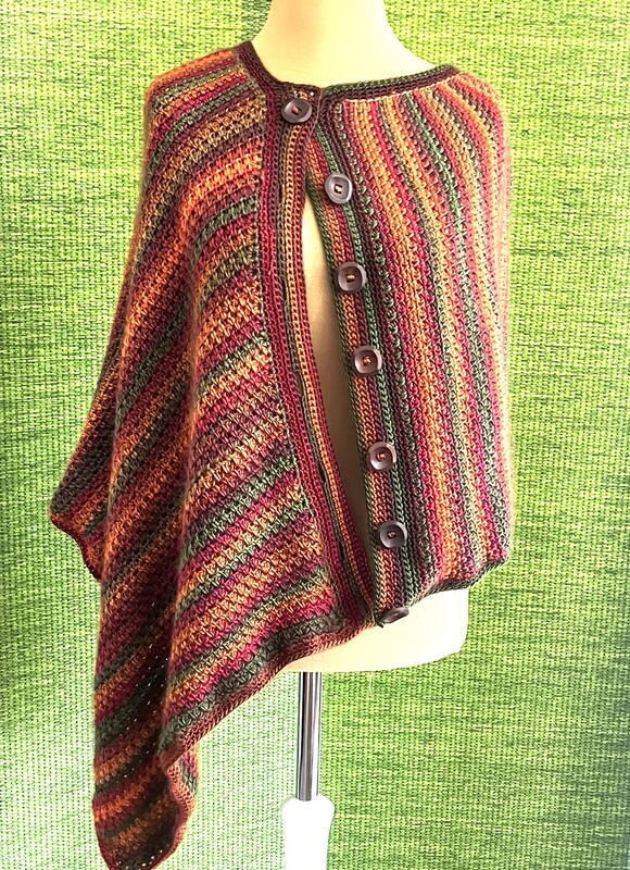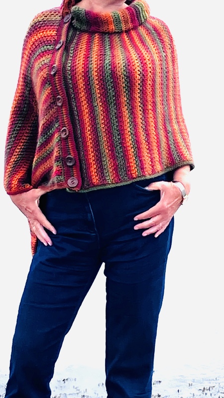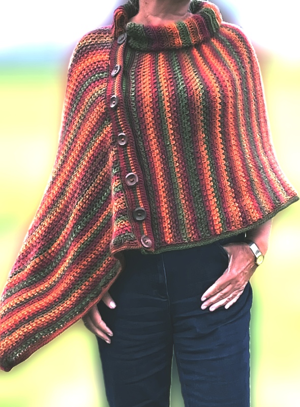 Dieser Poncho lässt sich in vielen Variationen tragen. Er ist mit dieser Anleitung sehr einfach zu häkeln! Und das mit Nadelstärke 5! Du häkelst einen einfachen Schal, legst ihn wie in der Anleitung gezeigt zusammen, vergibst die Knopfleiste und fertig ist der Poncho. Wenn du magst fügst du noch einen warmen Rollkragen zu und du bist geschützt gegen jedes Wetter. Man kann den Poncho auch geschlossen als Pullover arbeiten, ohne die Knöpfe. Das zeige ich in der Anleitung.