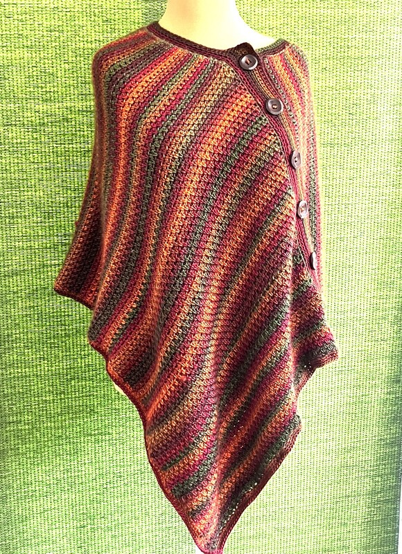 Der Poncho ist im Grund Uni-Size, aber du kannst ihn sehr einfach größer machen, damit er noch geräumiger deinen Körper umspielt. Er ist also in wirklich allen Größen häkelbar, ob Mann oder Frau oder Kind.