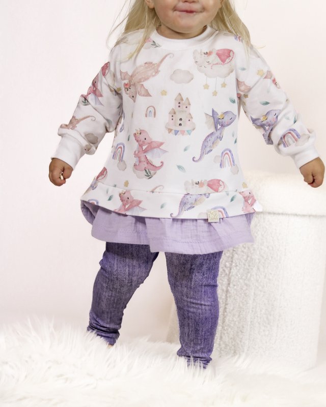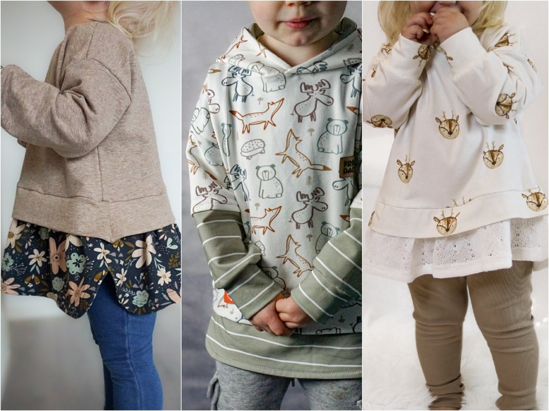 Für Mädchen gibt es gleich 3 verschiedene Möglichkeiten einen extra ausgestellten Sweater mit Volant zu nähen und das auch noch in zwei verschiedenen Längen.